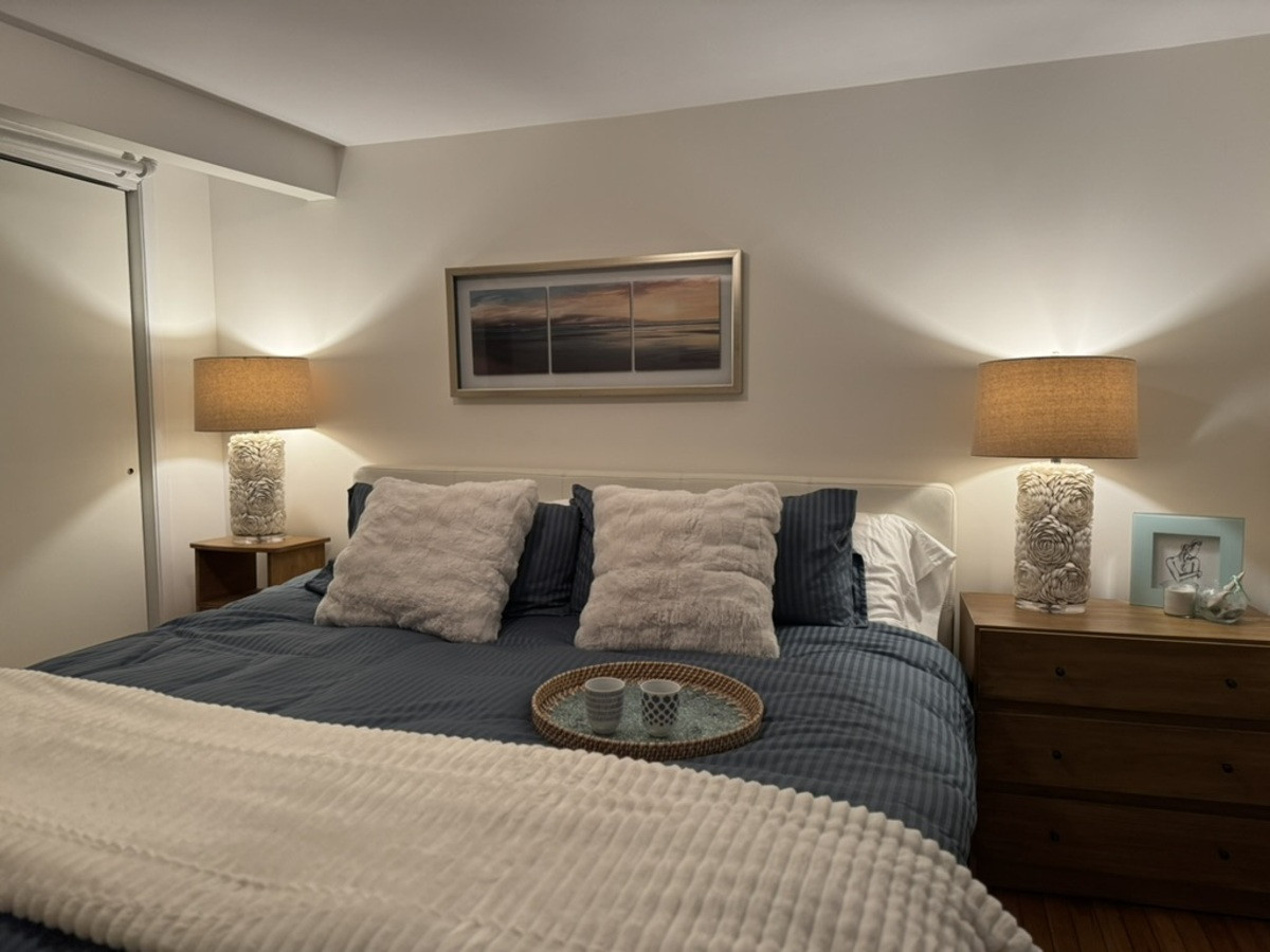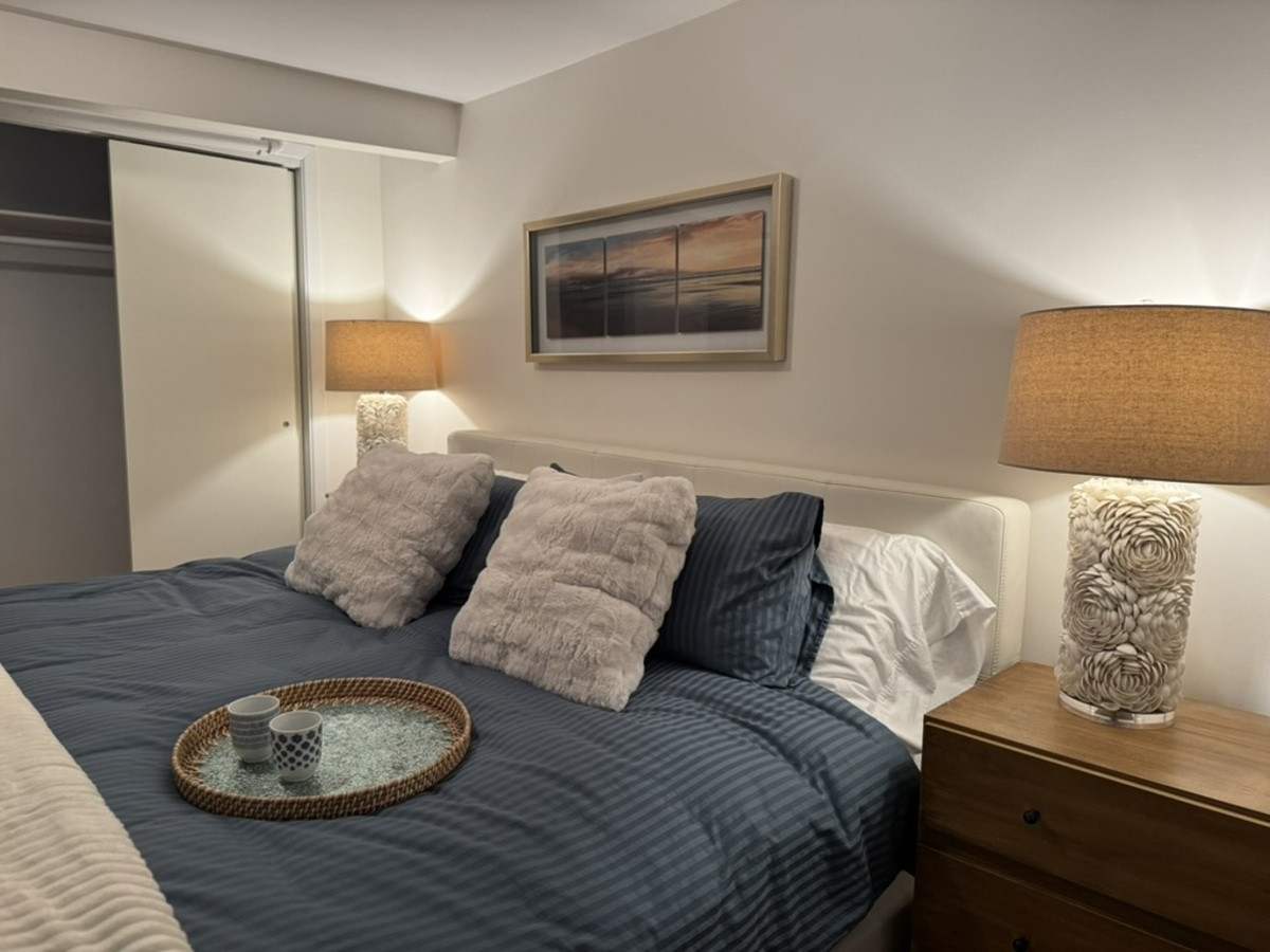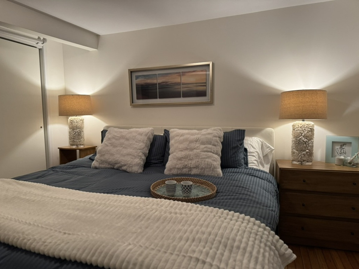 L'appartement dispose d'une chambre confortable avec un lit king size et un lit d'appoint, garantissant un sommeil paisible pour tous. La cuisine américaine entièrement équipée séduira les amateurs de cuisine, avec ses équipements modernes incluant une plaque à induction, un réfrigérateur, un congélateur, un four, un micro-ondes, et même une machine à café.