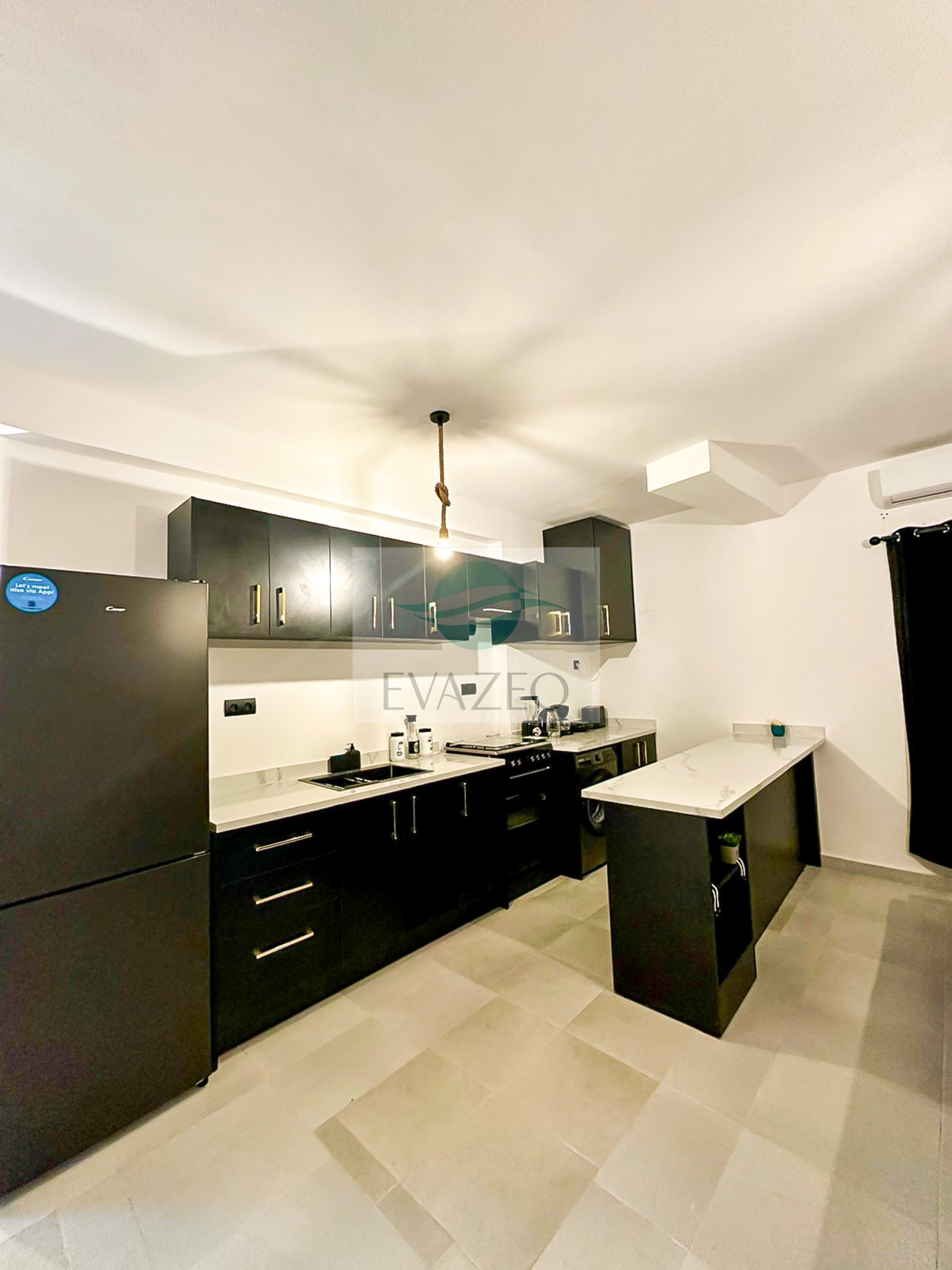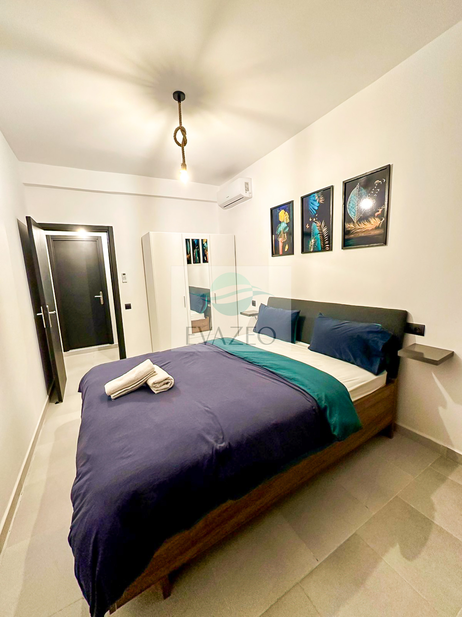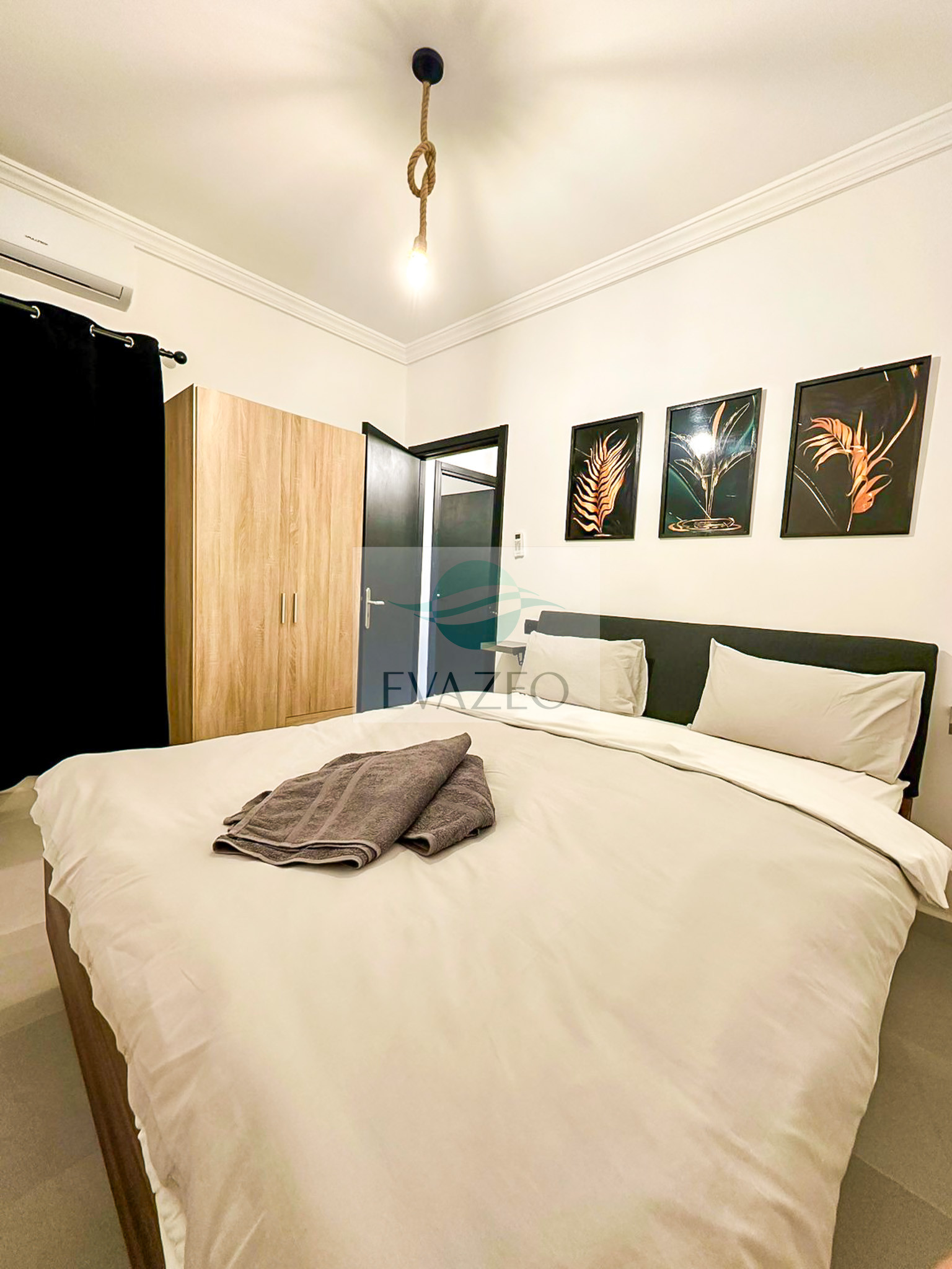 L'appartement dispose de deux chambres avec deux lits queen size, parfaits pour accueillir jusqu'à 4 personnes. La cuisine indépendante est entièrement équipée avec des appareils modernes : réfrigérateur, congélateur, machine à café, four, et une collection complète de vaisselle et ustensiles de cuisine.