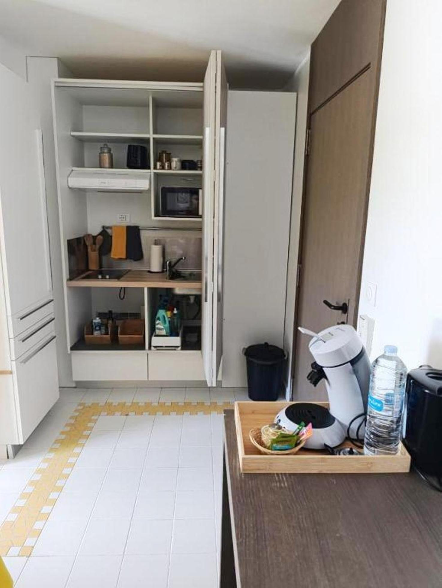 Equipements de la cuisine : plaques de cuisson, four micro-ondes, réfrigérateur avec compartiment congélateur, cafetière Senseo, grille-pain, divers ustensiles de cuisine et jeu de vaisselle complet.