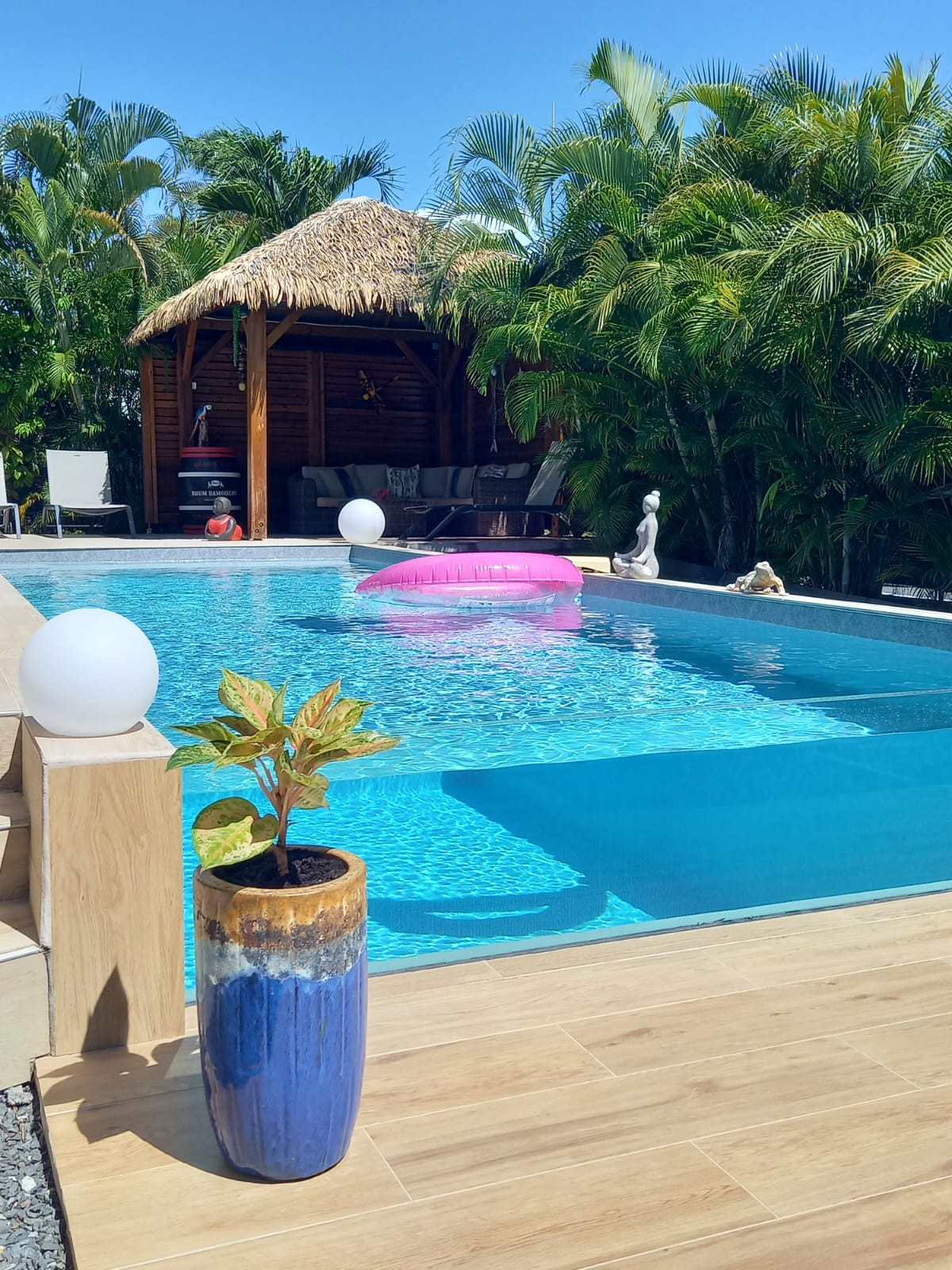 Jardin/terrasse : terrasse couverte avec salons d'extérieur complets pour les repas. Carbet couvert dans le prolongement de la piscine pour la détente.