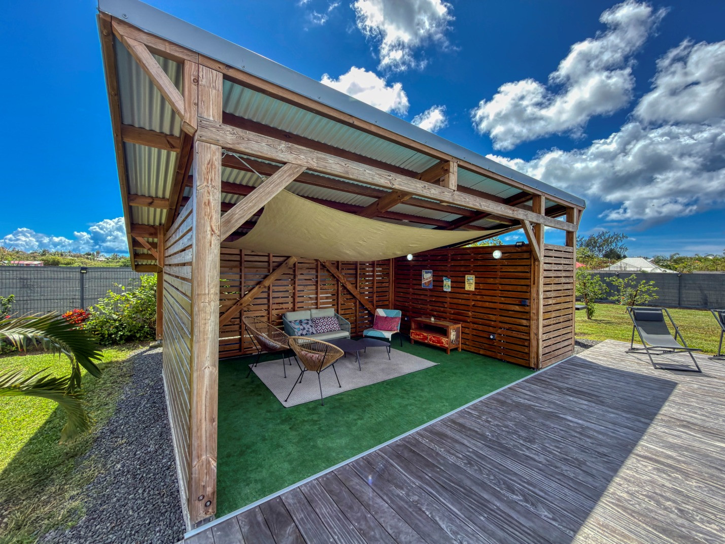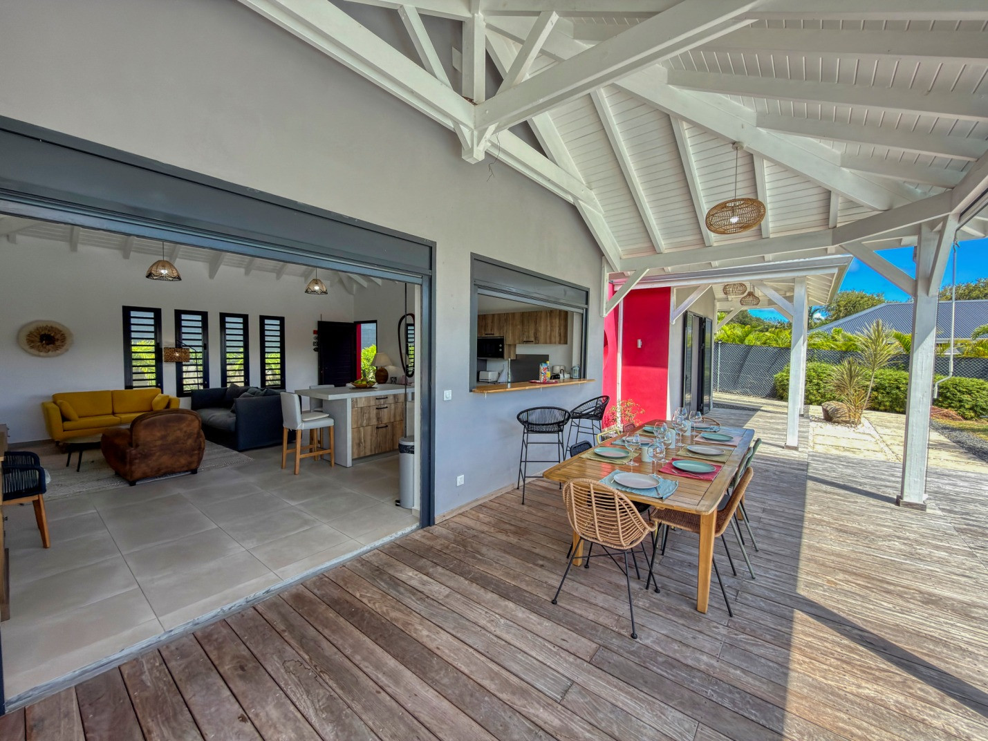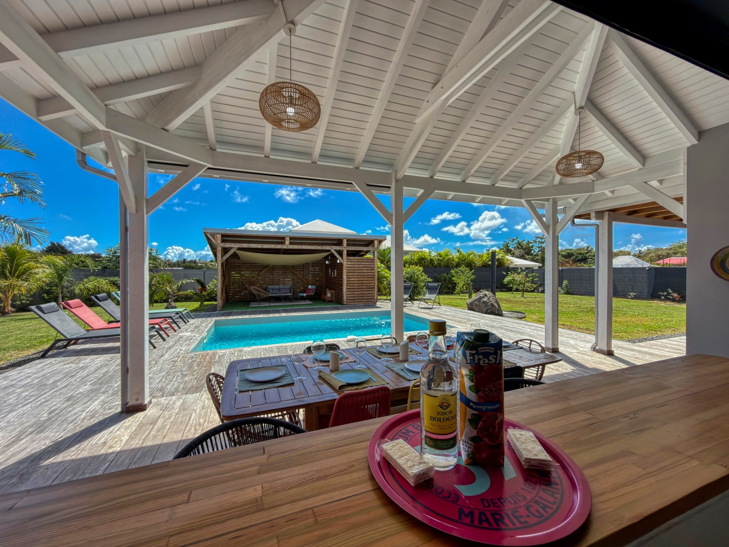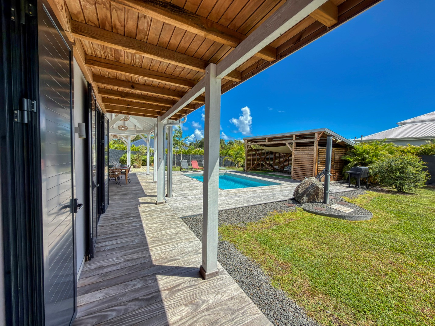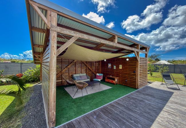 Jardin/terrasse : terrasse couverte avec mobilier d'extérieur complet pour les repas et les moments de détente. Carbet couvert face à la piscine idéal pour l'apéritif.
