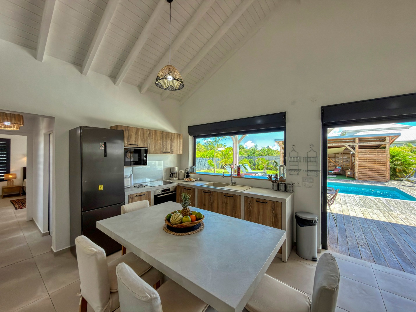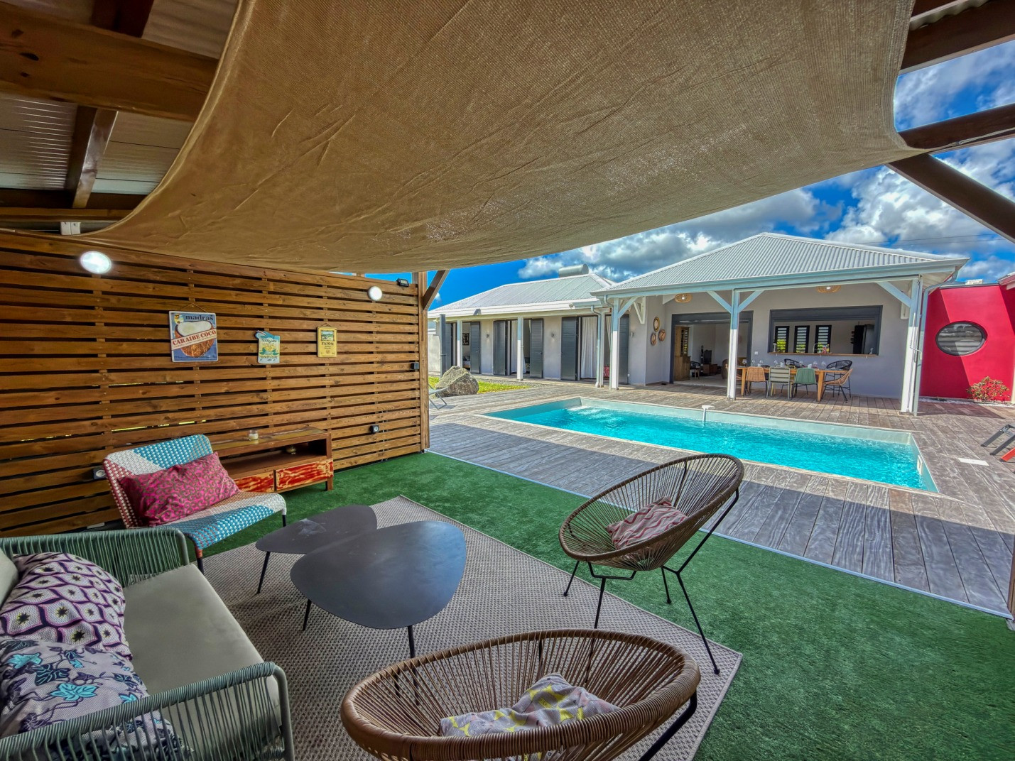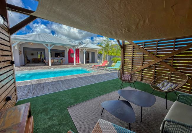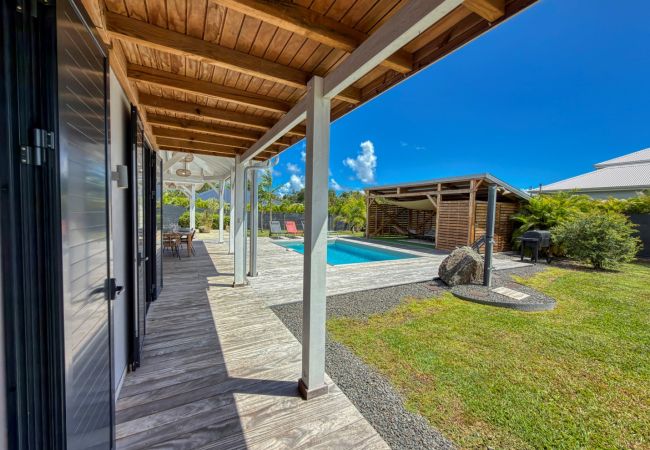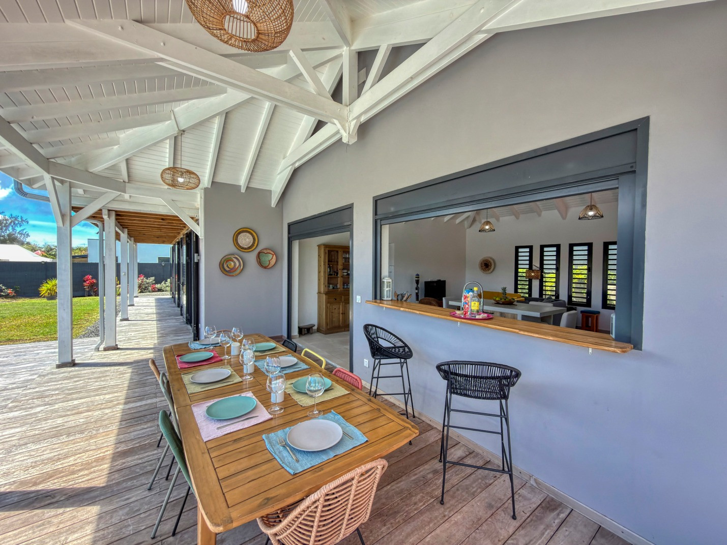 Jardin/terrasse : terrasse couverte avec mobilier d'extérieur complet pour les repas et les moments de détente. Carbet couvert face à la piscine idéal pour l'apéritif.