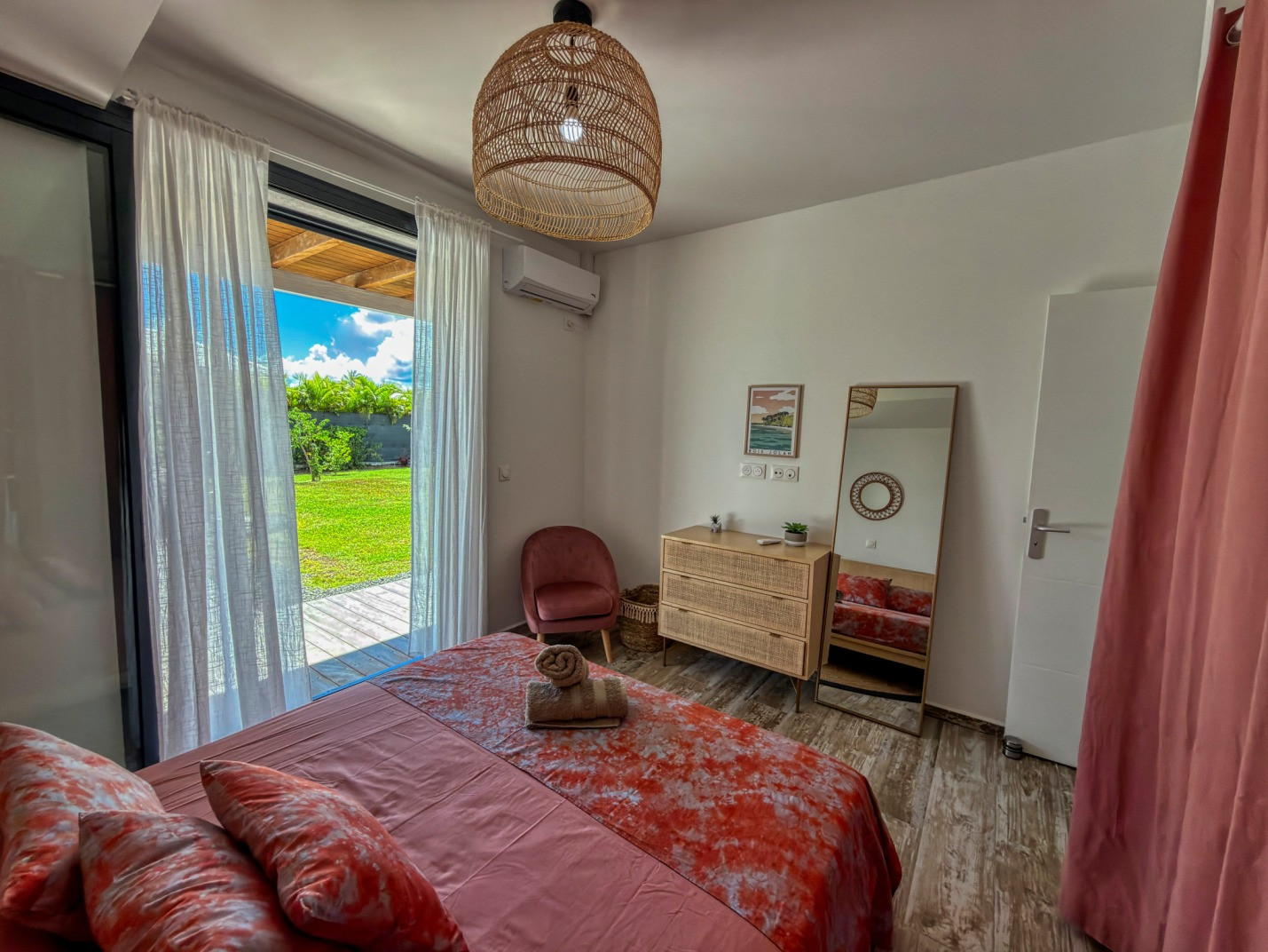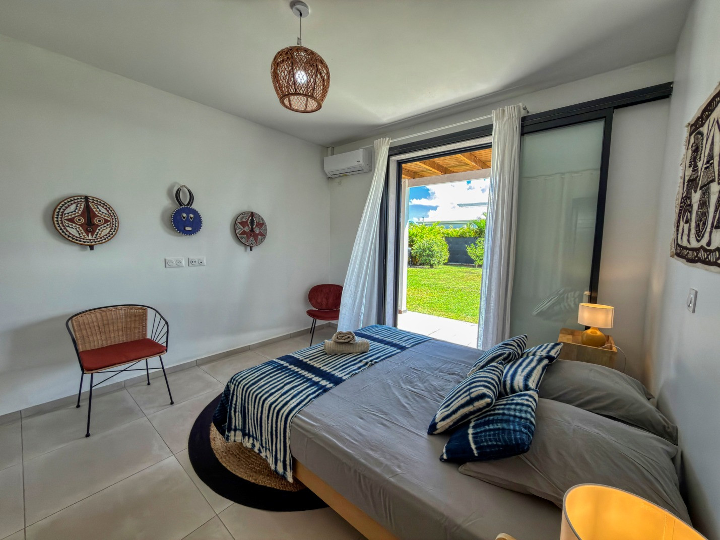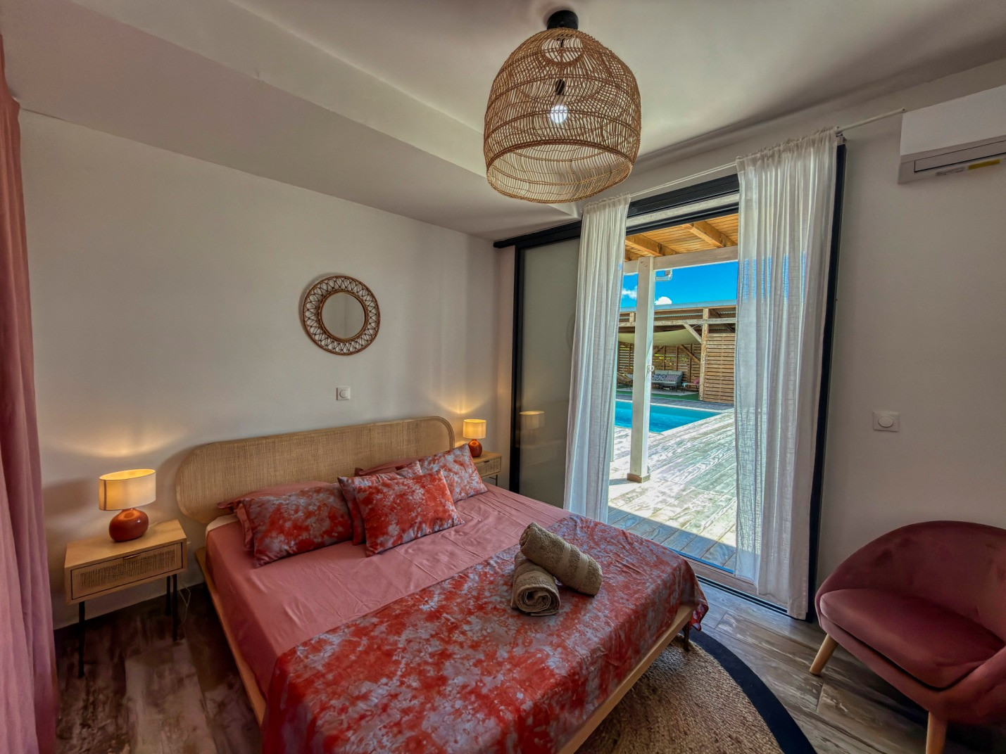 Climatisation : oui dans chaque chambre. Deux ventilateurs sur pied sont mis à disposition dans le salon équipé d’un canapé lit.