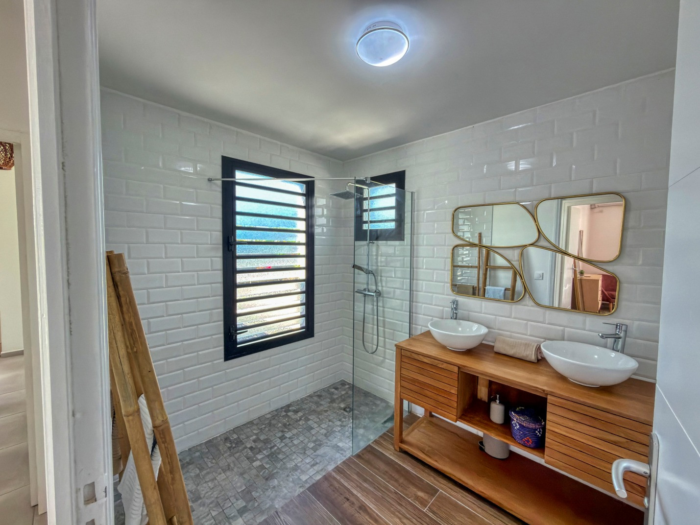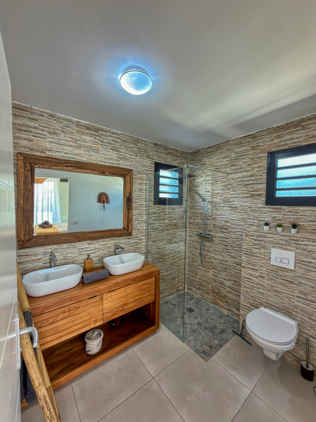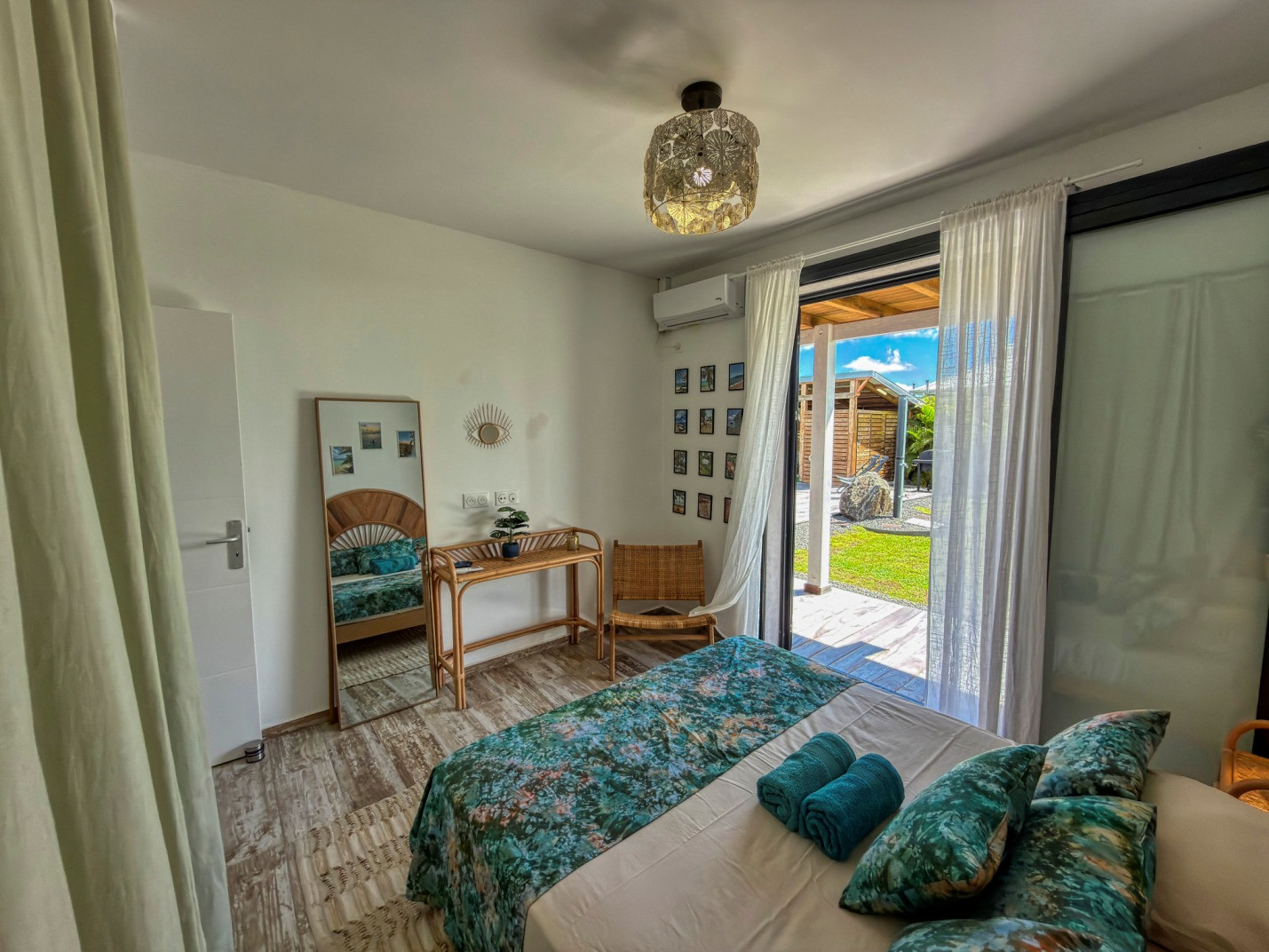Climatisation : oui dans chaque chambre. Deux ventilateurs sur pied sont mis à disposition dans le salon équipé d’un canapé lit.