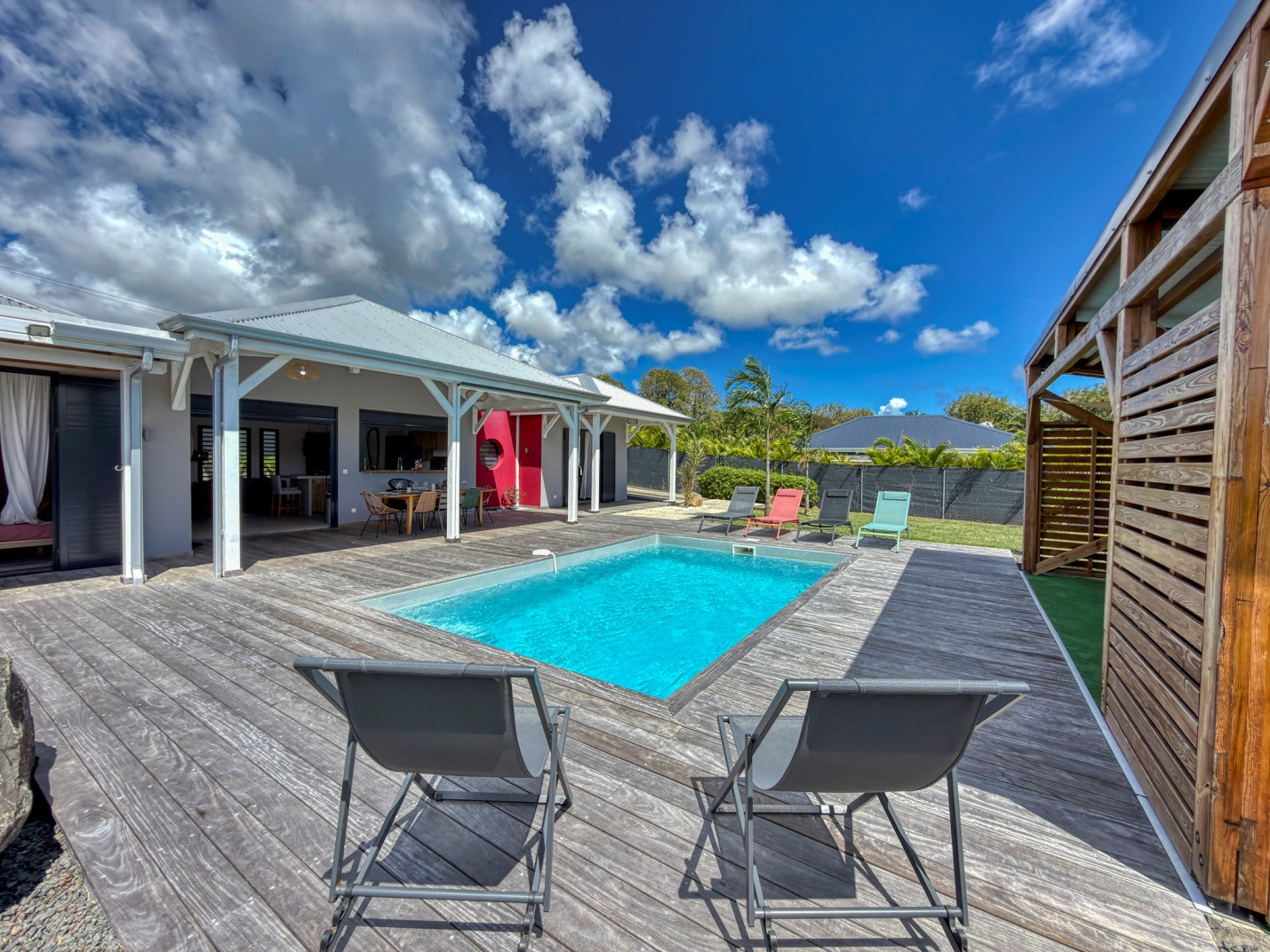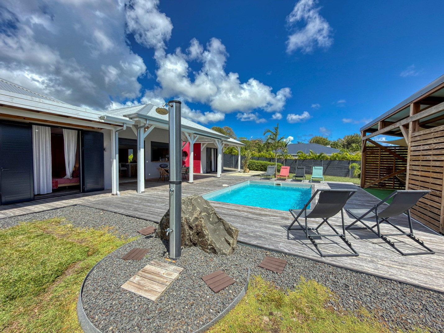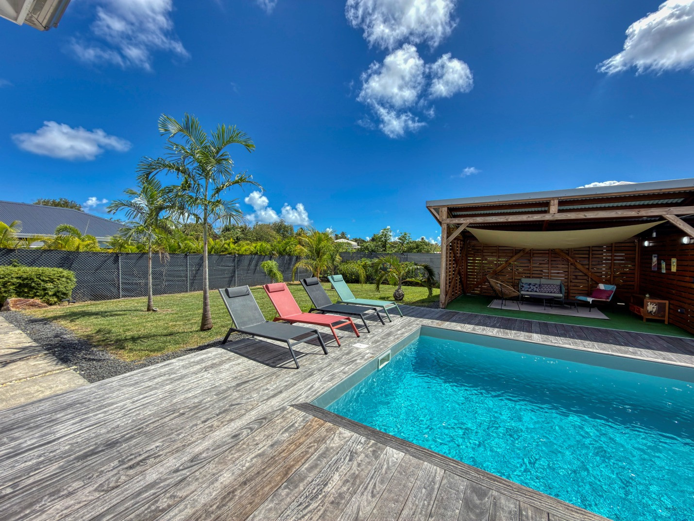 Piscine : oui, jolie piscine d'environ 4mx3m avec une profondeur maximale de 1,6m disposant d'une barrière de sécurité amovible pour les enfants. Transats et carbet d'agrément pour le farniente.