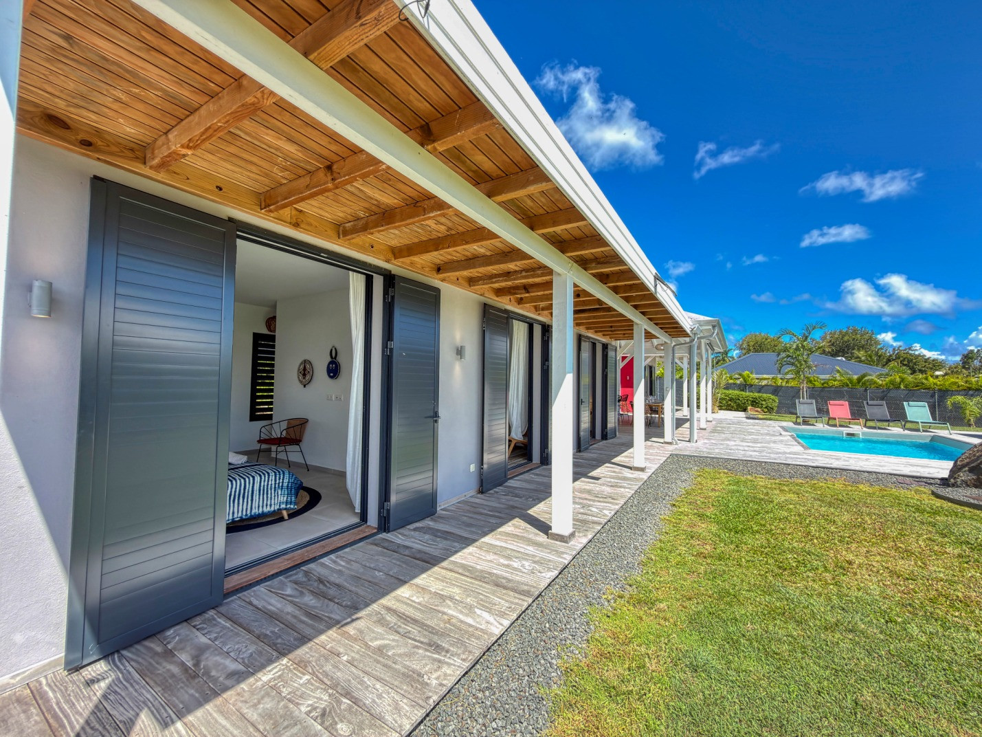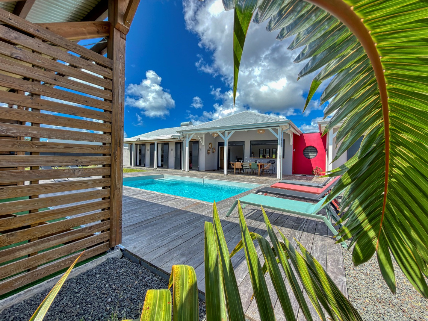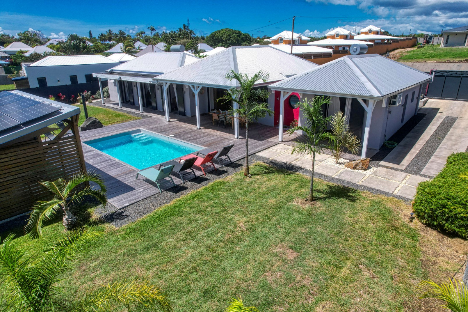 Piscine : oui, jolie piscine d'environ 4mx3m avec une profondeur maximale de 1,6m disposant d'une barrière de sécurité amovible pour les enfants. Transats et carbet d'agrément pour le farniente.