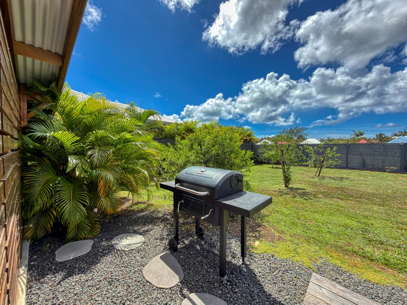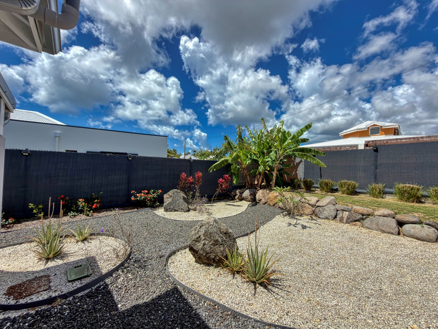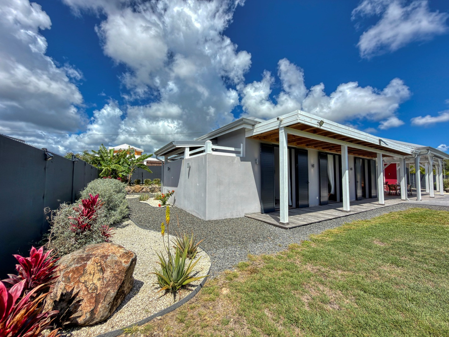 Jardin/terrasse : terrasse de 30 m² avec hamacs et salon d'extérieur complet pour les repas ou la détente. Le jardin de 800 m² entièrement cloturé, sans aucun vis à vis, dispose de projecteurs et de 2 lampadaires pour profiter davantage de vos soirées et du jardin tropical illuminé.