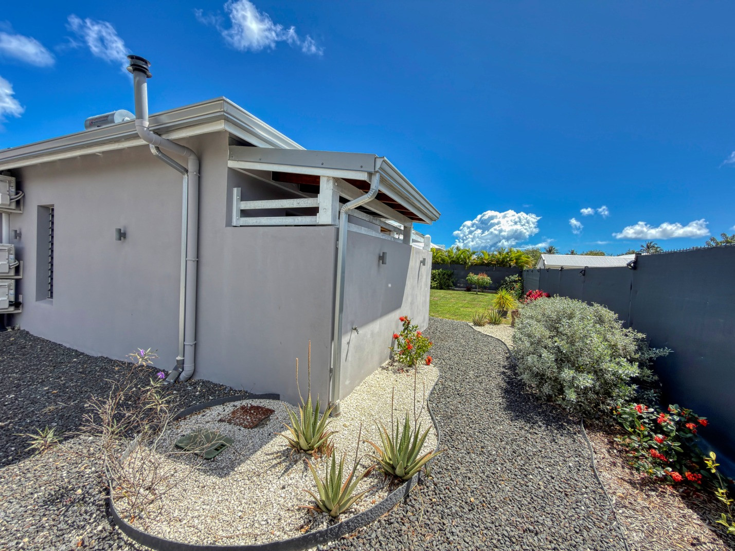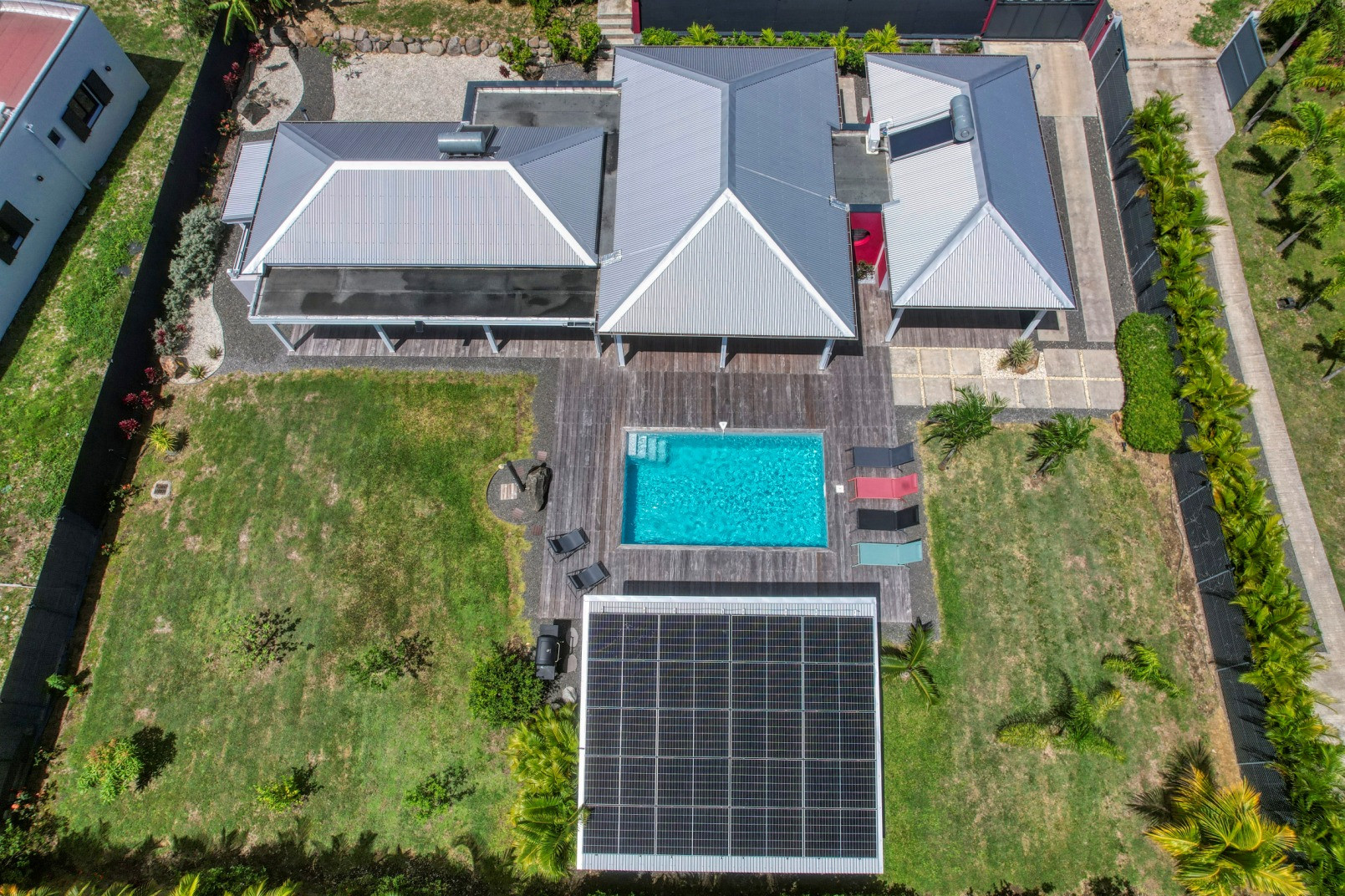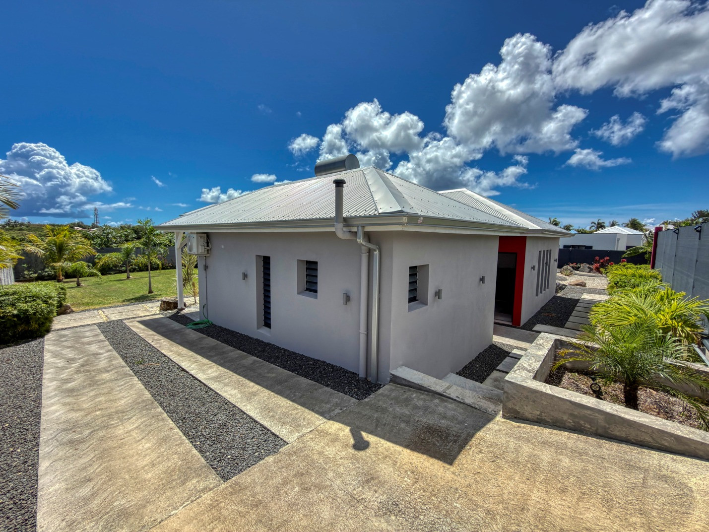 Jardin/terrasse : terrasse de 30 m² avec hamacs et salon d'extérieur complet pour les repas ou la détente. Le jardin de 800 m² entièrement cloturé, sans aucun vis à vis, dispose de projecteurs et de 2 lampadaires pour profiter davantage de vos soirées et du jardin tropical illuminé.