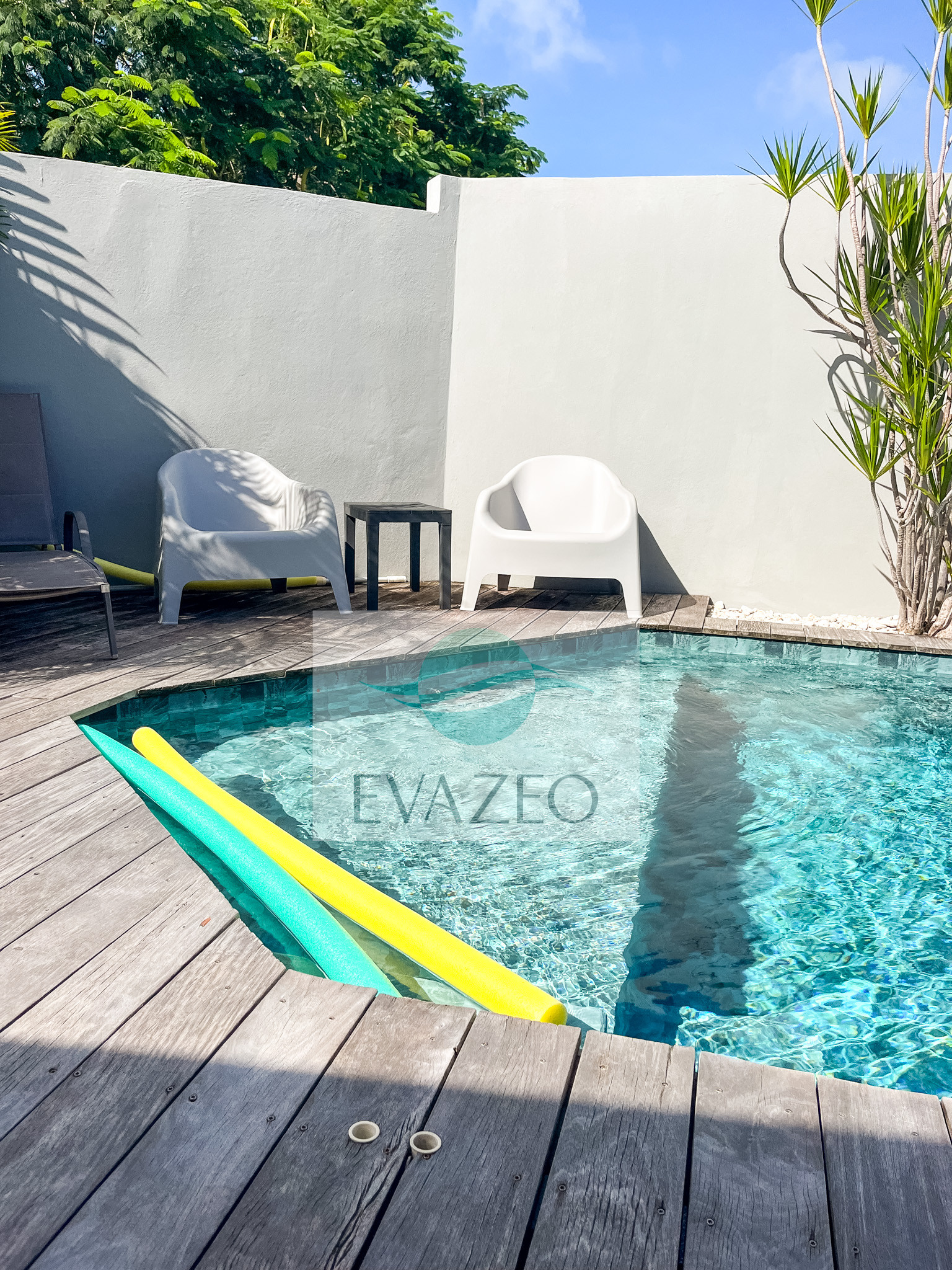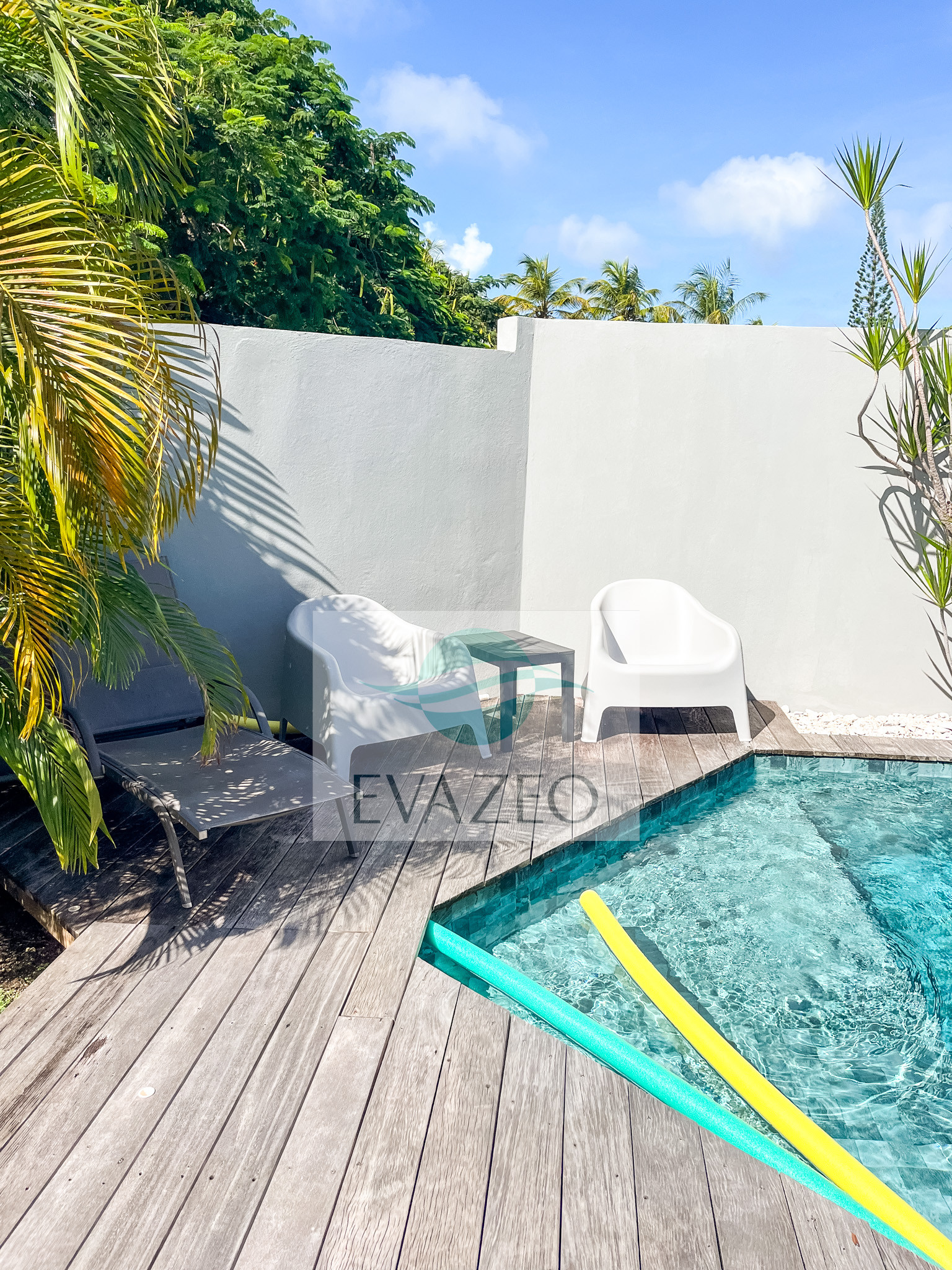 Agencement de la villa : elle comporte 2 chambres climatisées (1 chambre avec lit double en 160 cm, 2ème chambre avec lit double de 140 cm) avec pour chacune leur salle d'eau avec wc, séjour, cuisine équipée, terrasse et piscine privée.