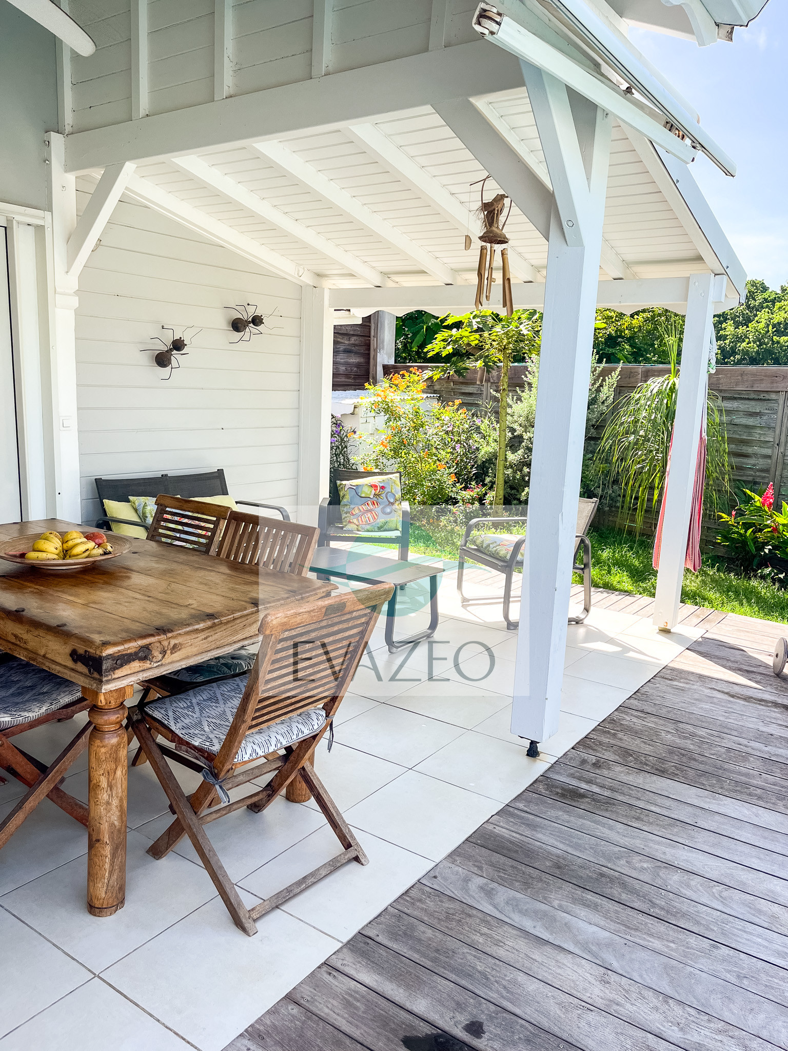 Jardin/terrasse : la villa est située sur un terrain arboré d'environ 800 m² entièrement cloturé. Vaste terrasse couverte avec mobilier d'extérieur complet pour les repas et les moments de détente.