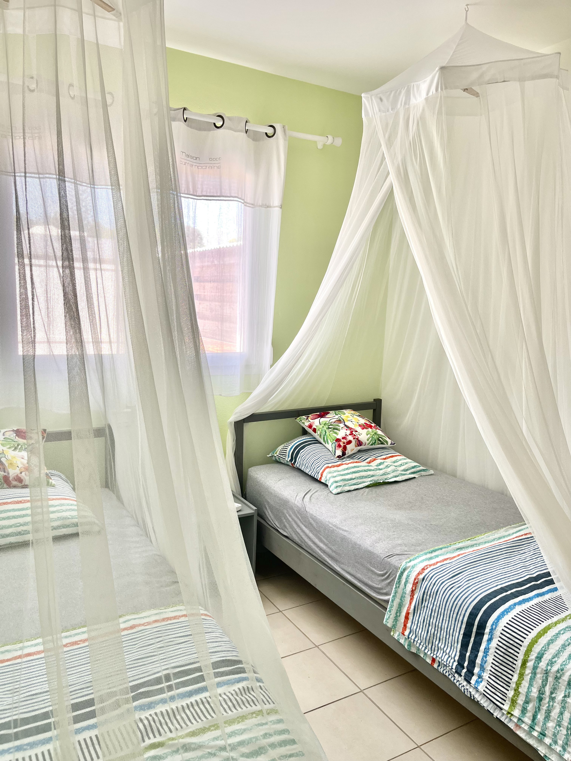 La villa dispose de deux chambres confortables pouvant accueillir jusqu'à 4 personnes et un bébé, avec un lit queen size et deux lits individuels. La climatisation dans les chambres garantira votre confort pendant les chaudes journées caribéennes. Un coffre-fort et un fer à repasser sont également à votre disposition pour plus de tranquillité.