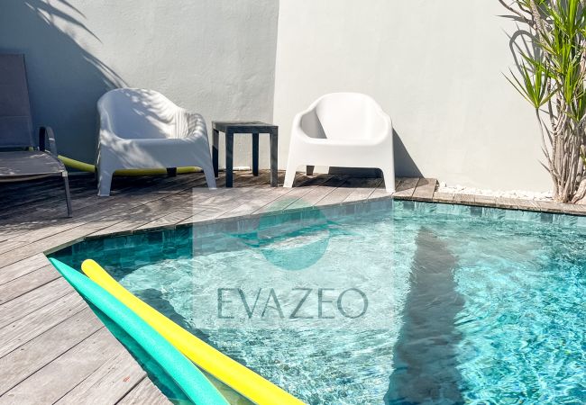 Agencement de la villa : la villa compte 2 chambres climatisées (la 1ère chambre dispose d'un lit de 160 cm et la seconde d'un lit de 140 cm), 1 salle d'eau, 1 wc indépendant, séjour avec canapé convertible pour une personne, cuisine équipée, terrasse, parking intérieur (jusqu'à 2 véhicules), jardin et piscine privée.
