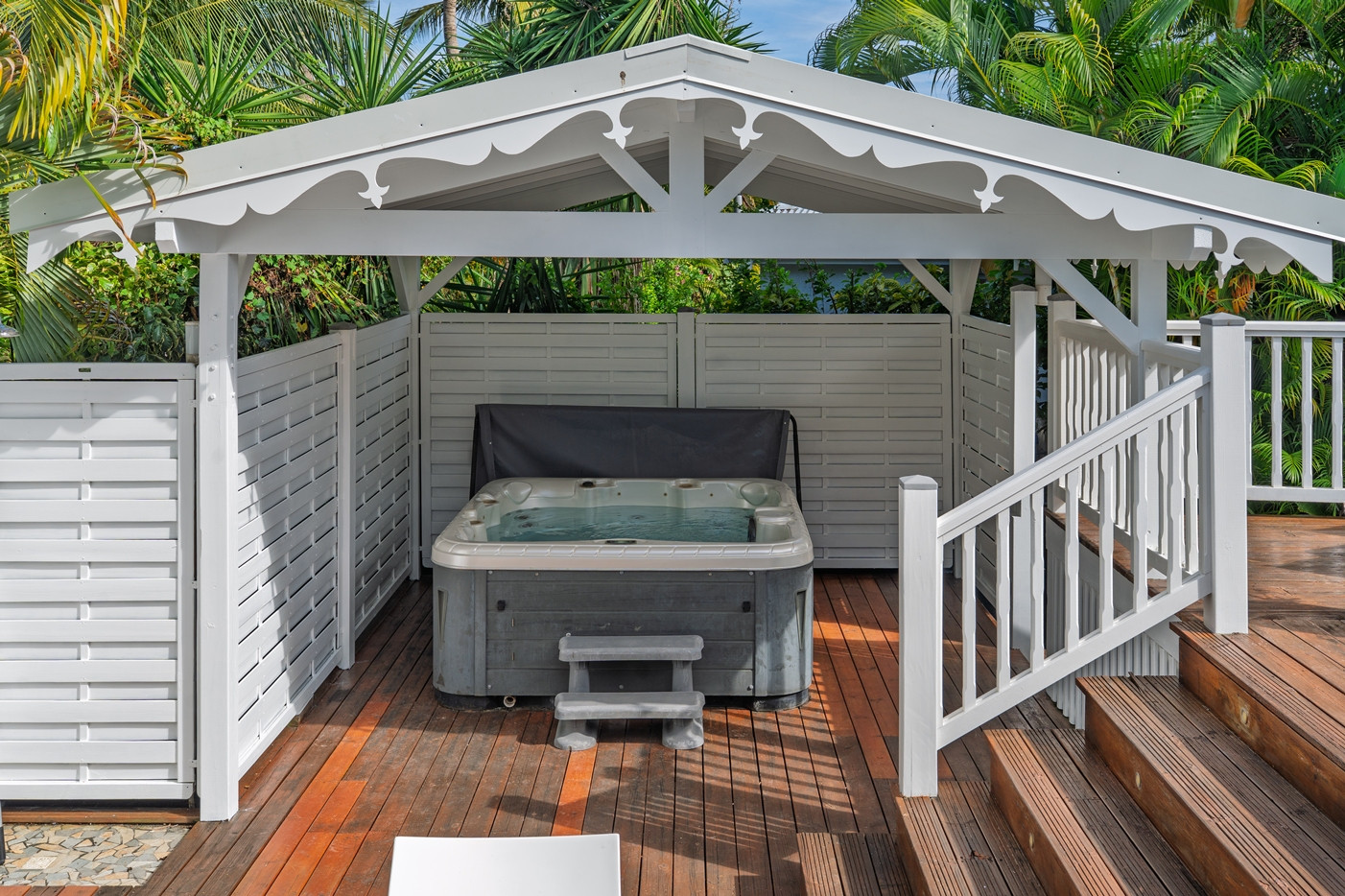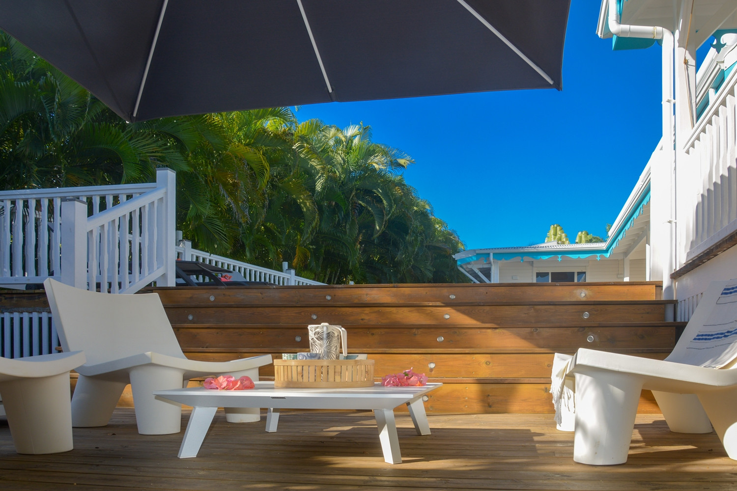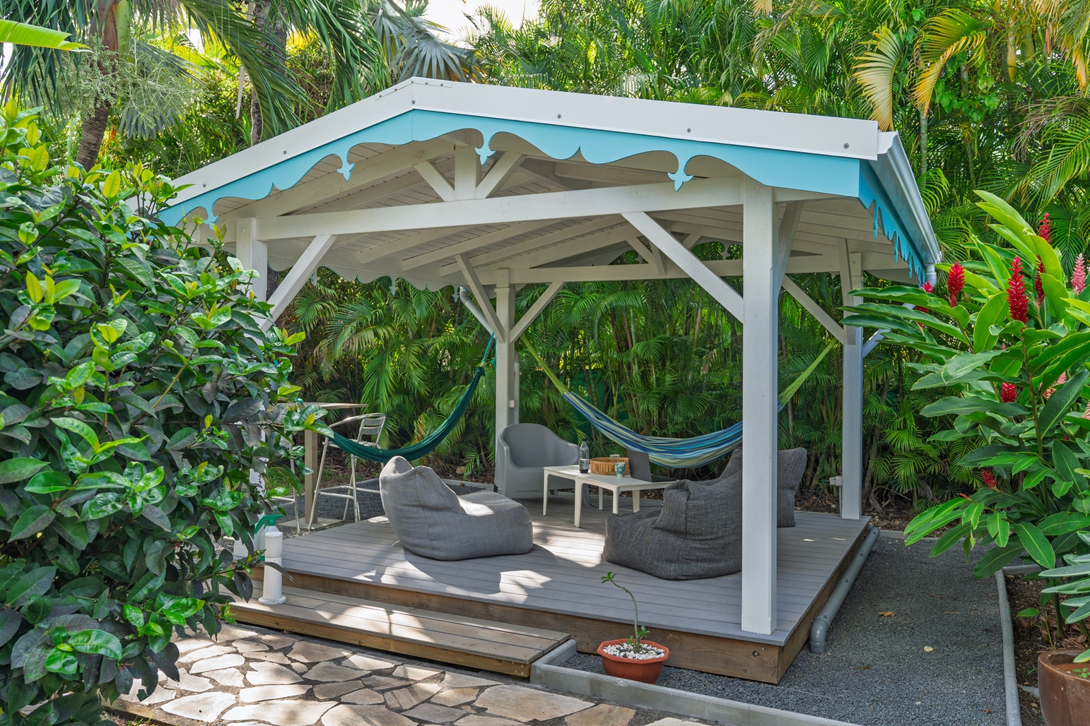 Jardin/terrasse : les villas sont en plein milieu d'un jardin tropical de 800m². Chaque maison dispose d'un large salon ouvert sur la végétation avec tout le mobilier nécessaire pour les repas et la détente.