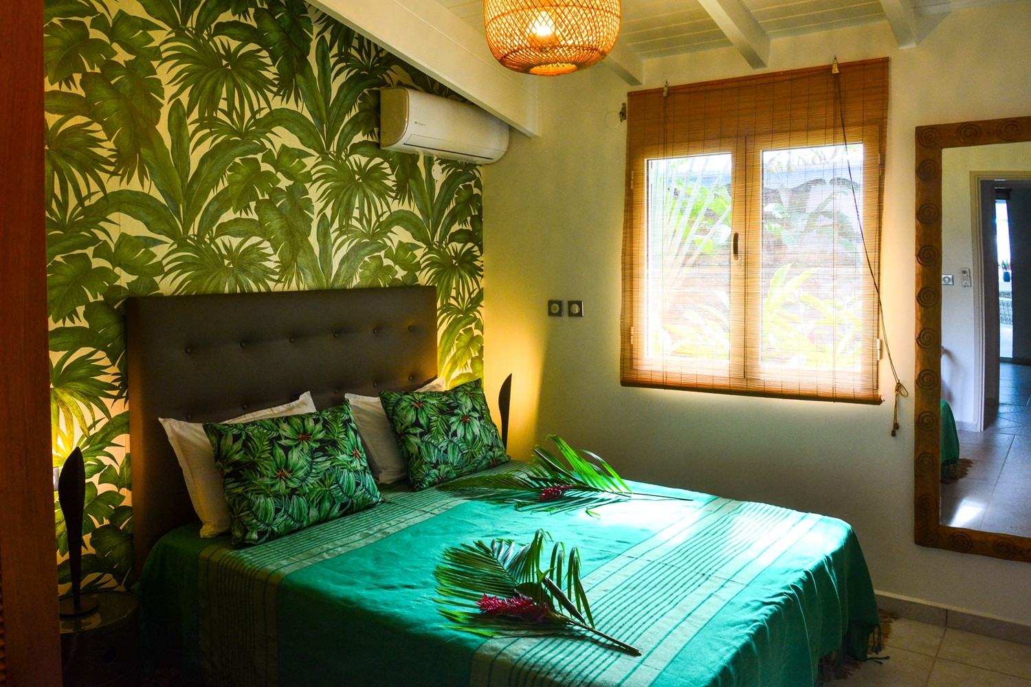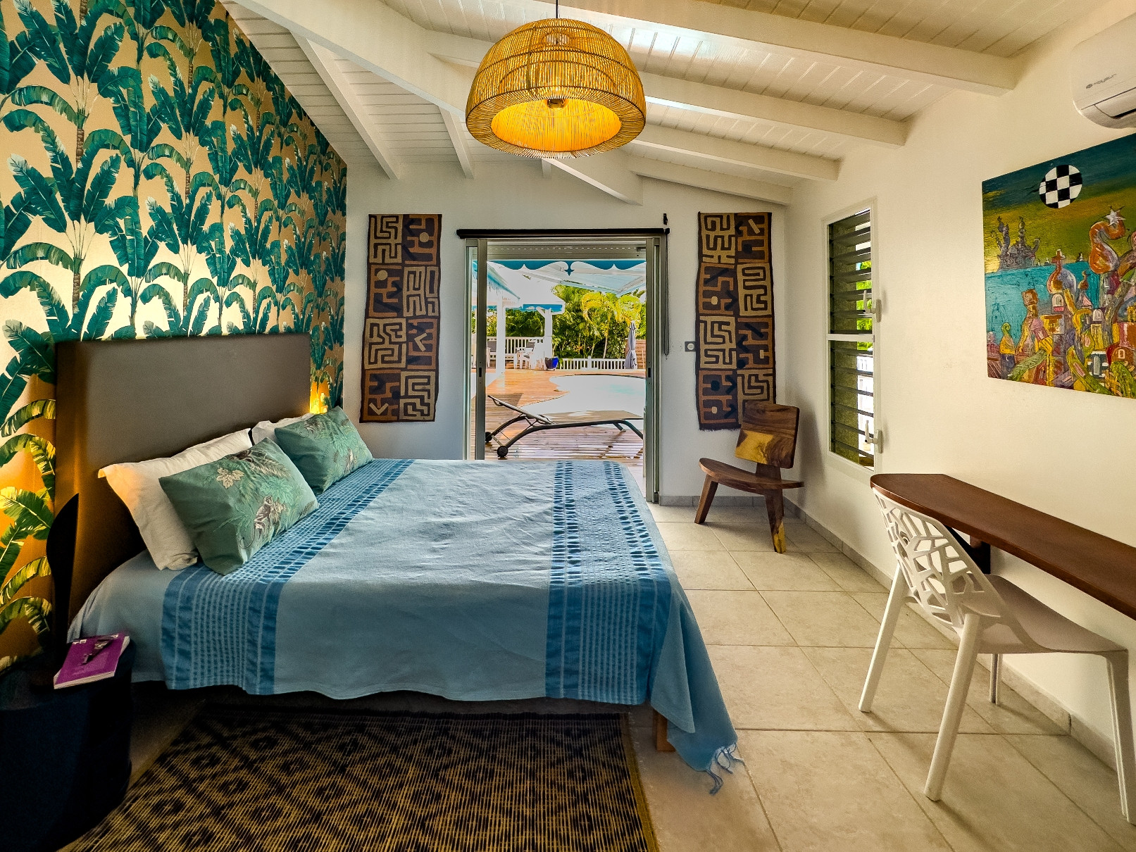 Climatisation : oui dans chaque chambre. Deux ventilateurs sur pied sont mis à disposition dans le salon équipé d’un canapé lit.
