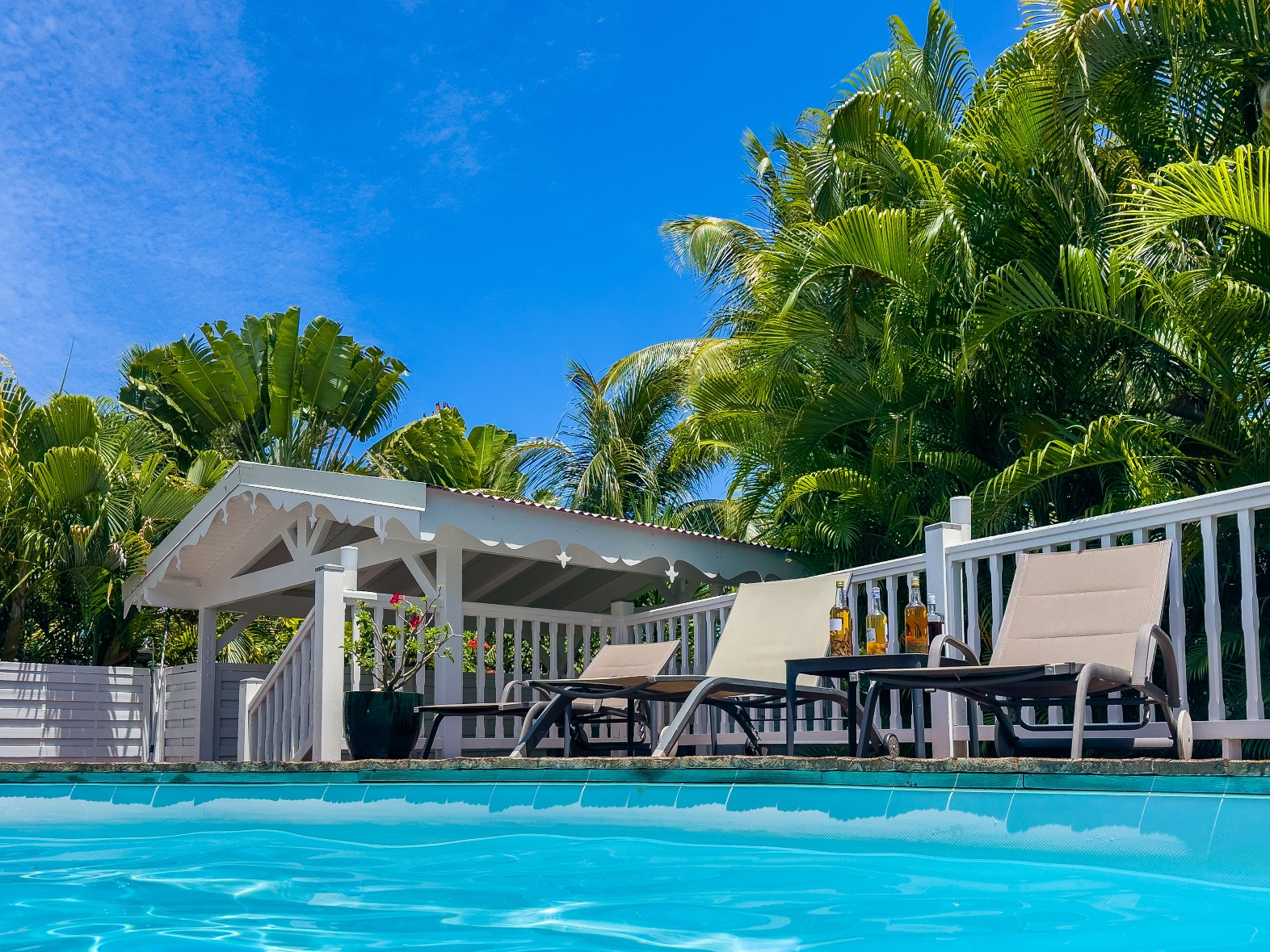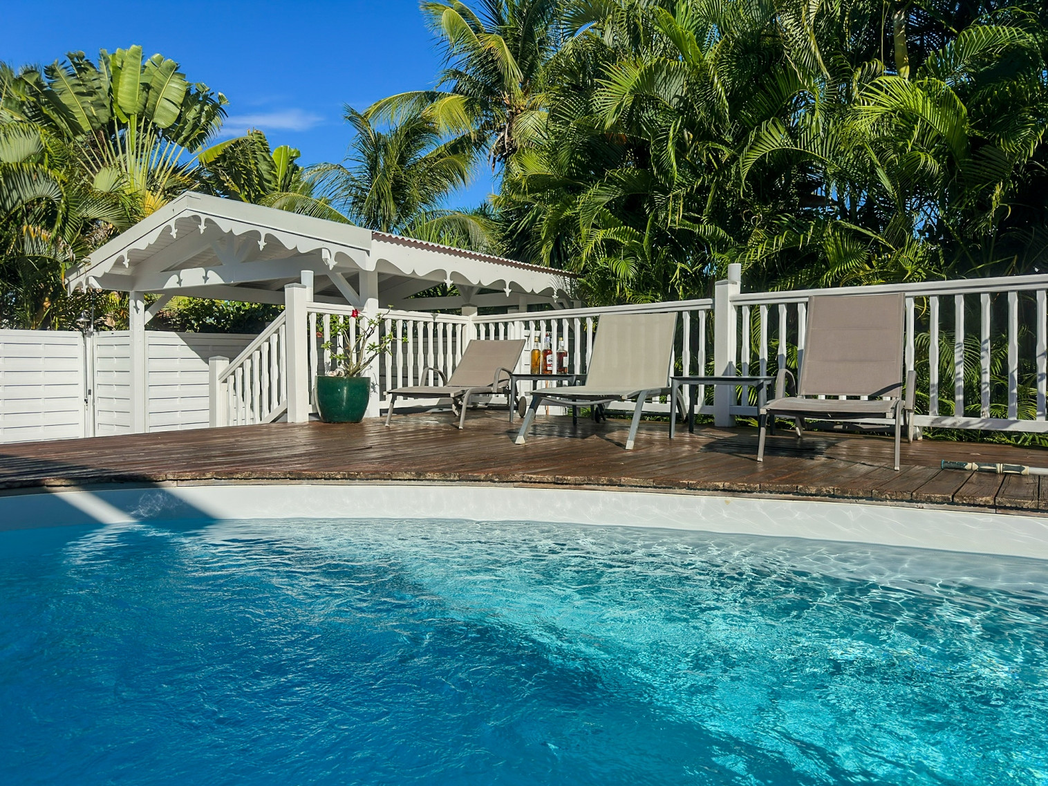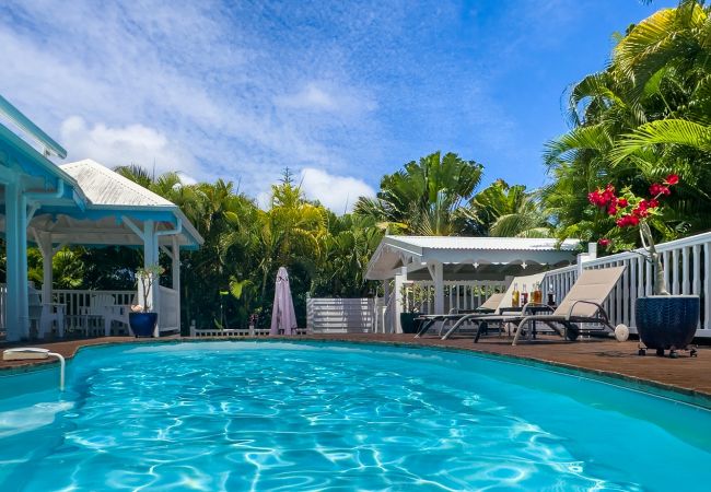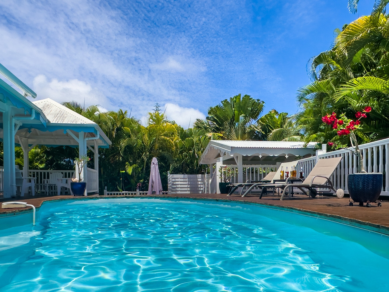 Piscine : oui, jolie piscine d'environ 4mx3m avec une profondeur maximale de 1,6m disposant d'une barrière de sécurité amovible pour les enfants. Transats et carbet d'agrément pour le farniente.