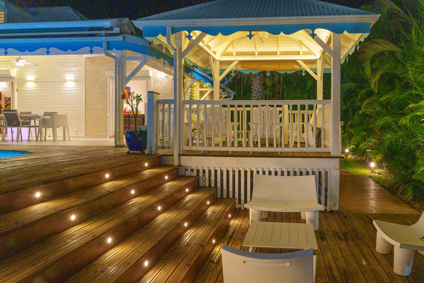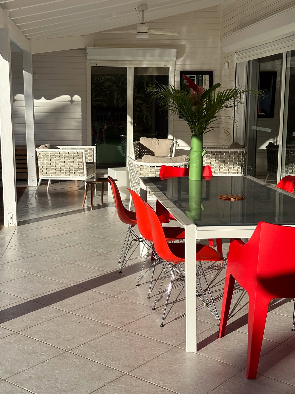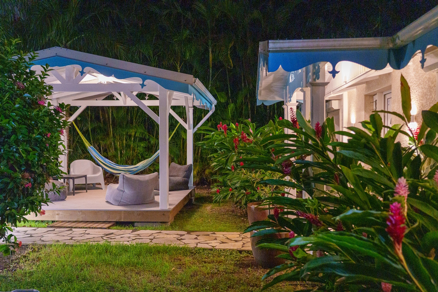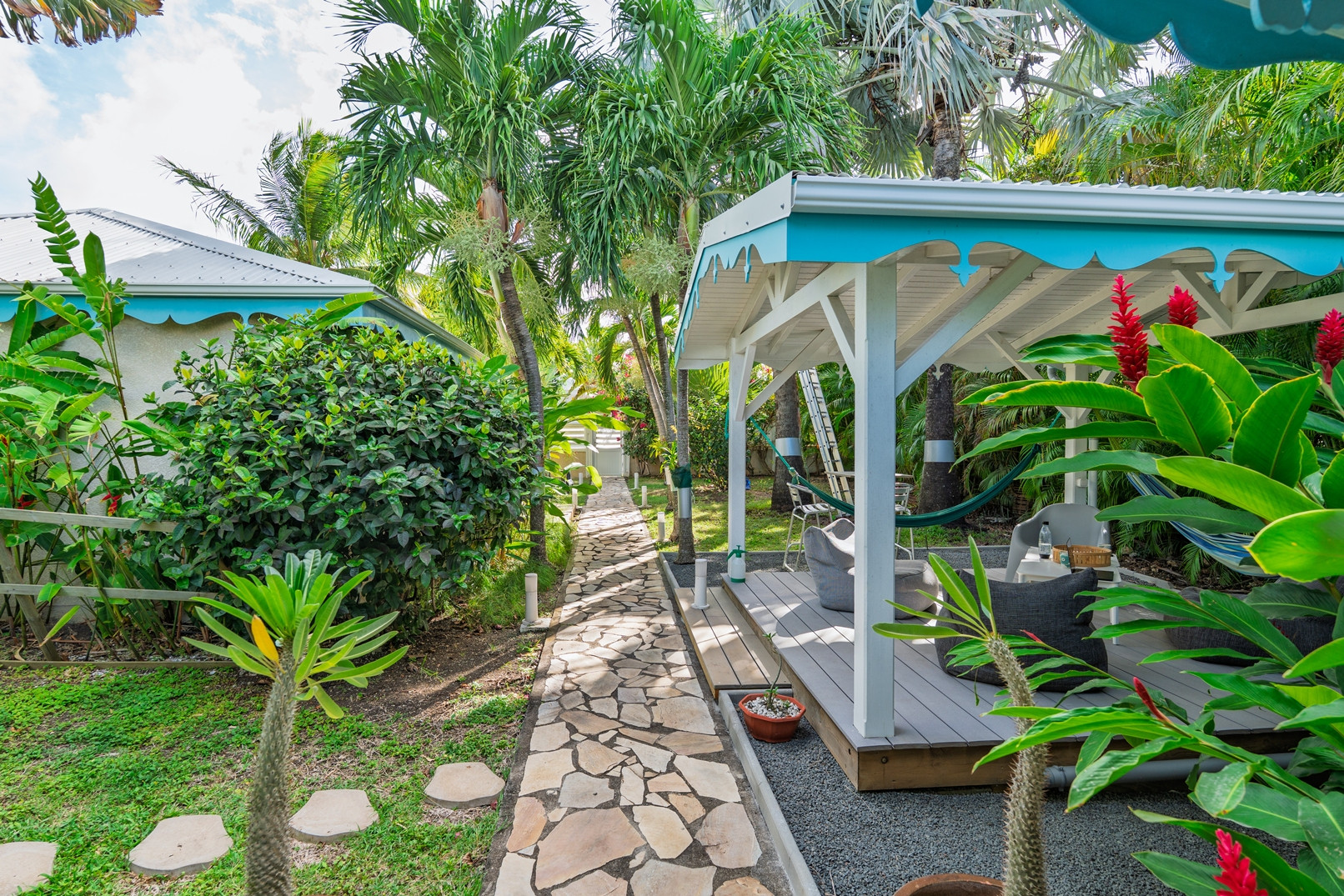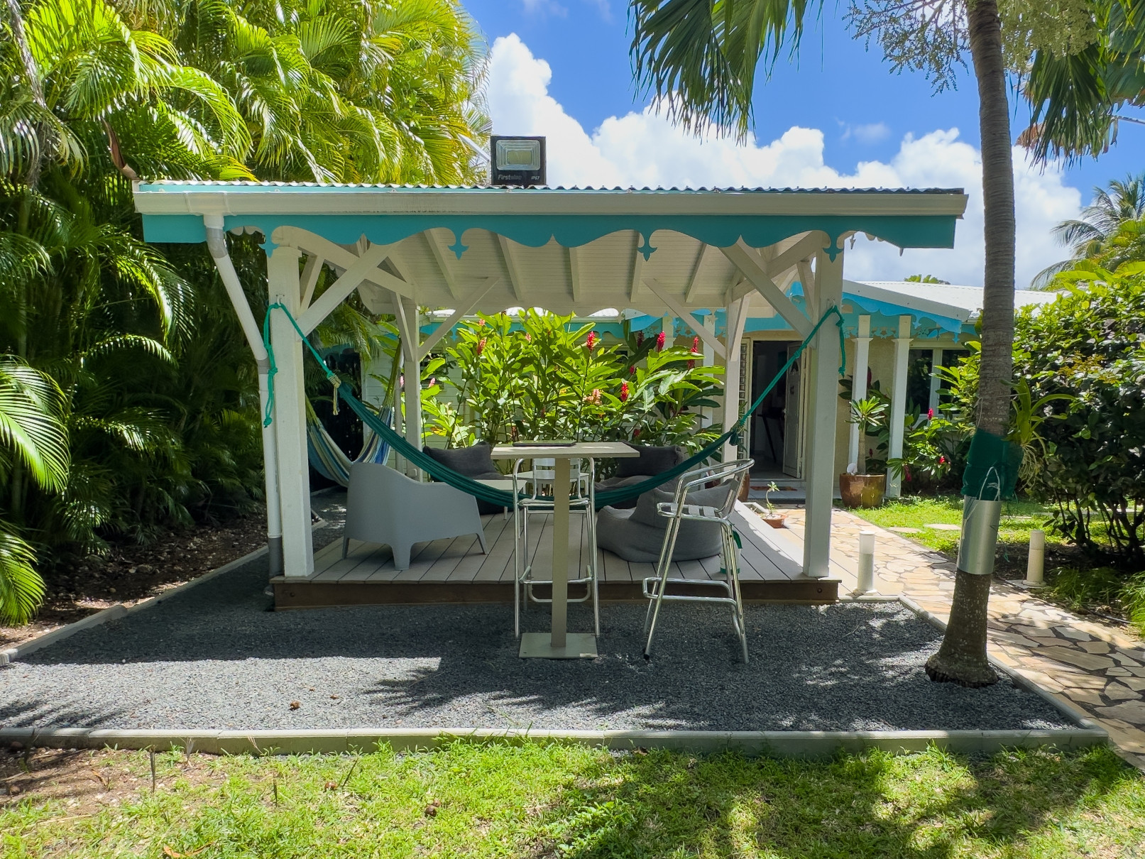 Jardin/terrasse : terrasse de 30 m² avec hamacs et salon d'extérieur complet pour les repas ou la détente. Le jardin de 800 m² entièrement cloturé, sans aucun vis à vis, dispose de projecteurs et de 2 lampadaires pour profiter davantage de vos soirées et du jardin tropical illuminé.