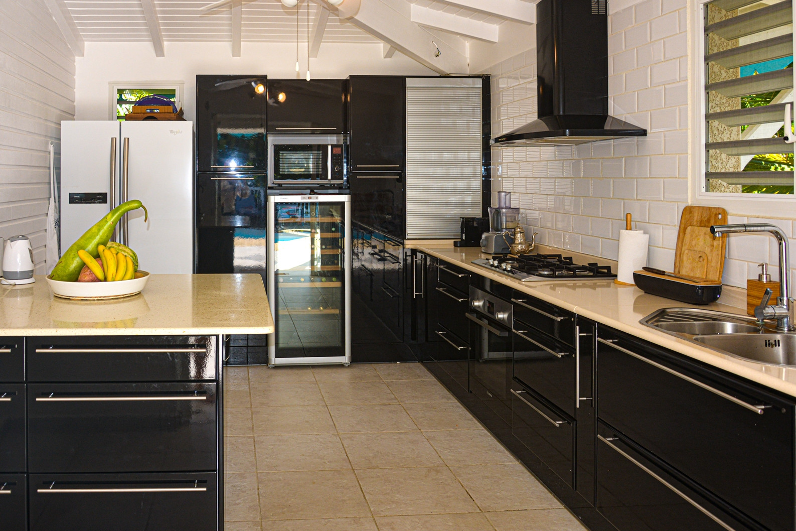 Equipements de la cuisine : cuisinière 4 feux de cuisson, hotte aspirante, réfrigérateur-congélateur, four, four micro ondes, lave vaisselle, cafetière Nespresso, bouilloire, grille pain, robot multi-fonctions, cave à vins, divers ustensiles de cuisine et jeu de vaisselle complet.