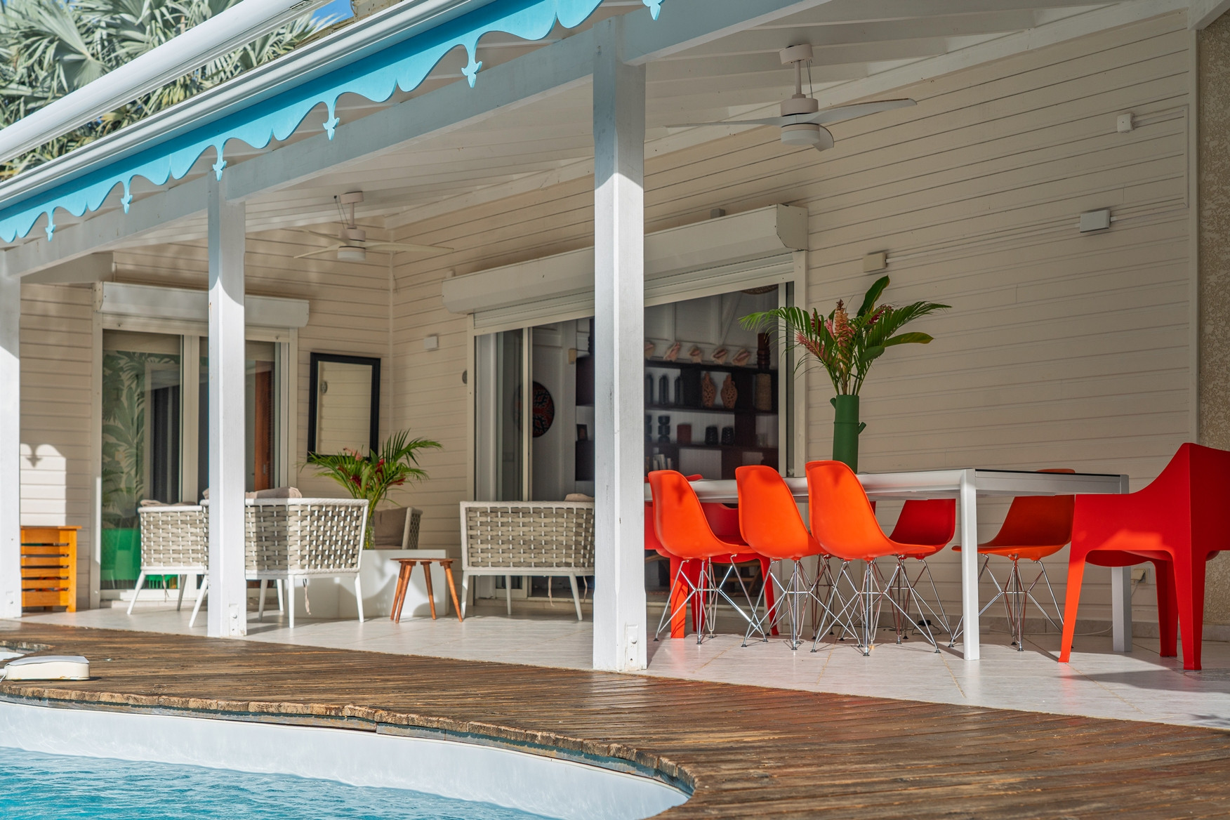 Agencement de la villa : elle dispose de 3 chambres climatisées (2 lits doubles de 160 cm et 1 lit de 140 cm), 1 salle de bain, 1 salle d'eau, 2 wc, séjour, cuisine équipée, terrasse avec hamacs, jardin et piscine privée.