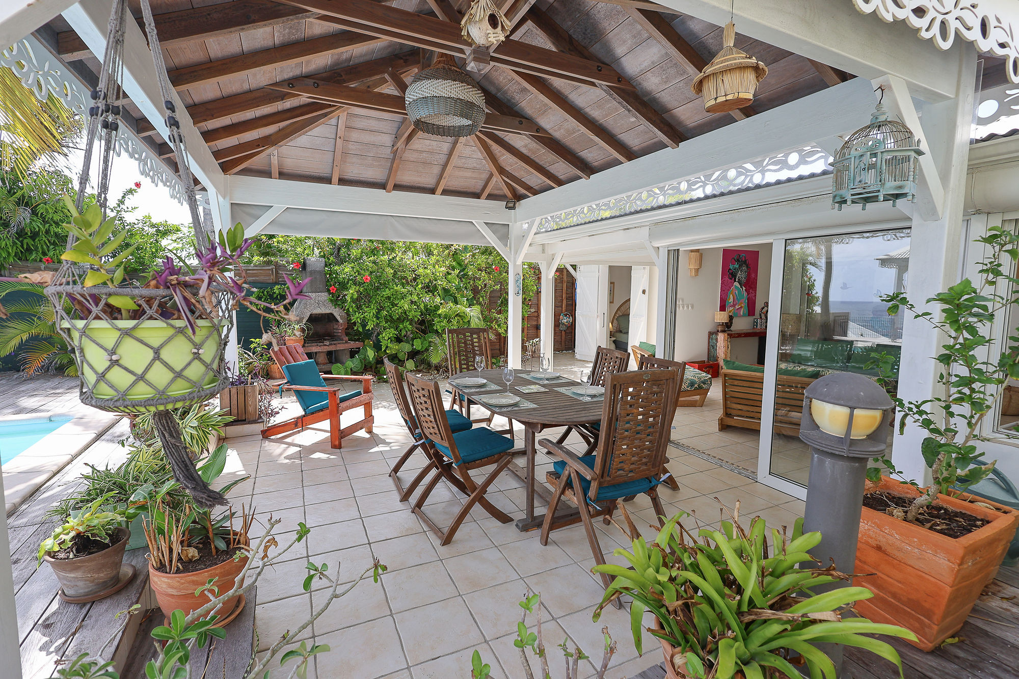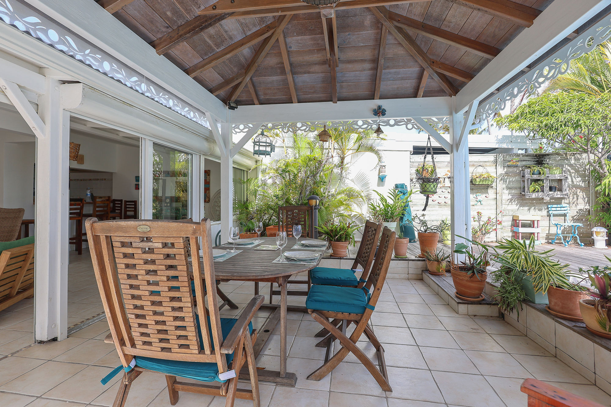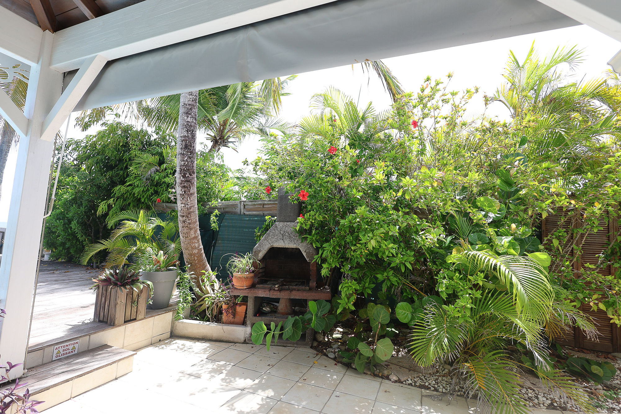 Jardin/terrasse : terrasse couverte avec salons d'extérieur pour les repas ou la détente. La maison est sur un terrain de 360 m² sans aucun vis-à-vis.
