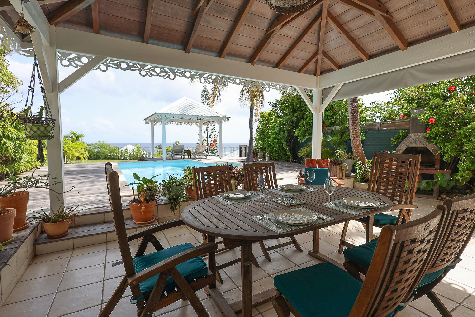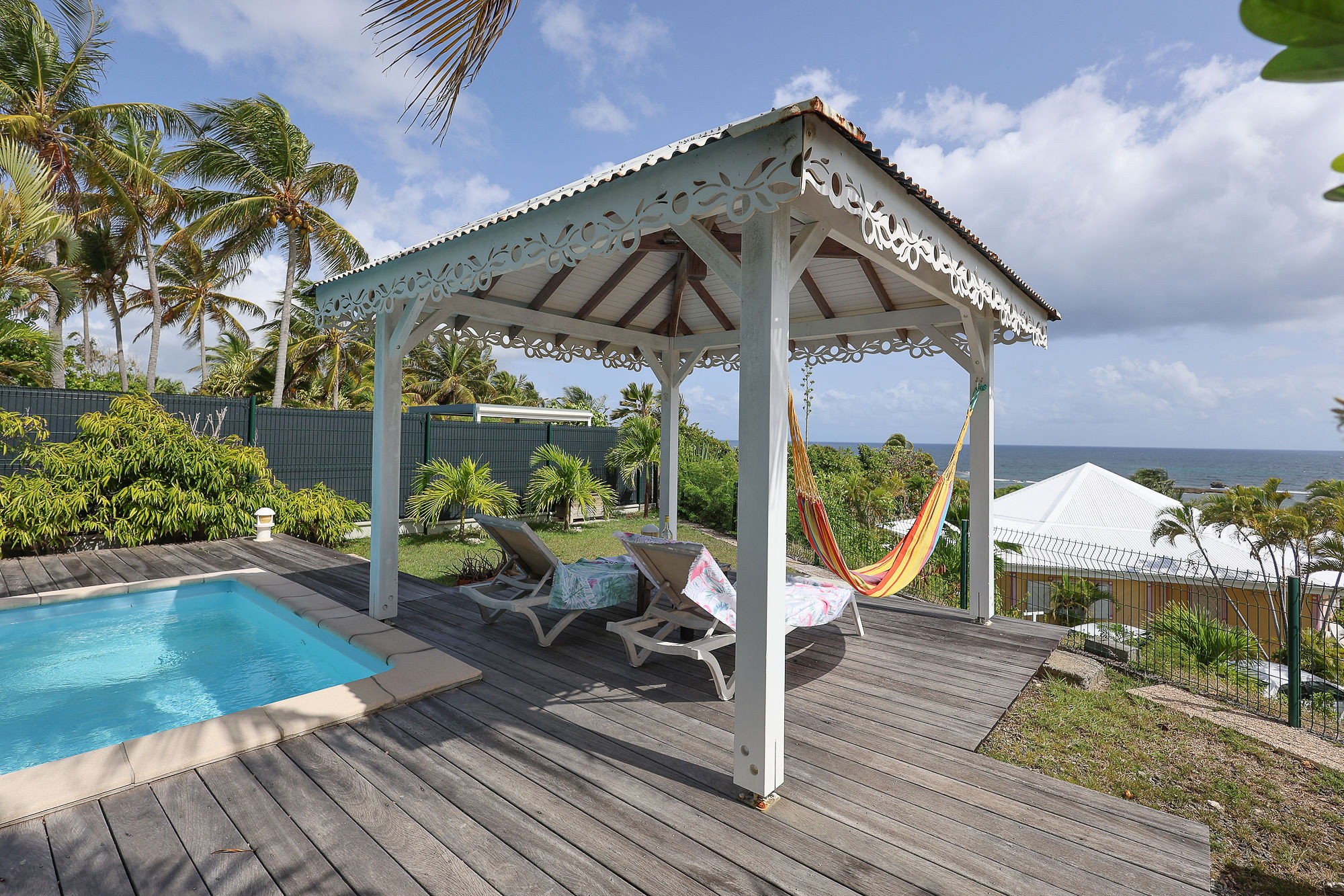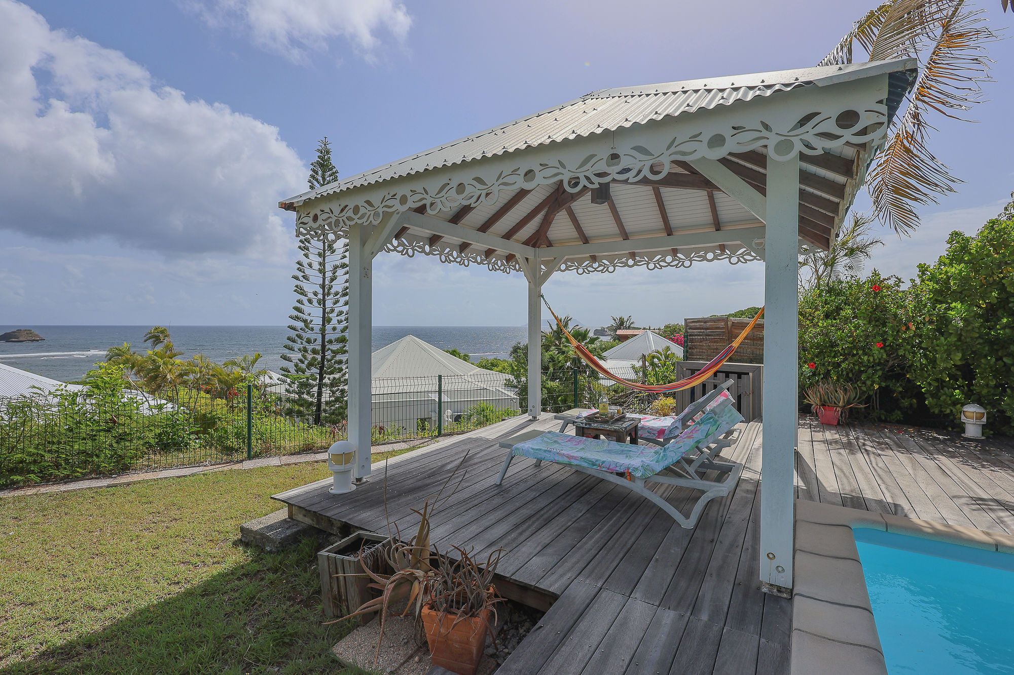 Jardin/terrasse : terrasse couverte avec salons d'extérieur pour les repas ou la détente. La maison est sur un terrain de 360 m² sans aucun vis-à-vis.