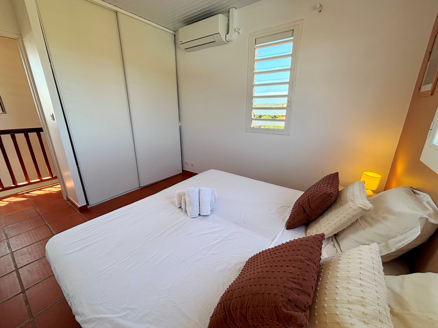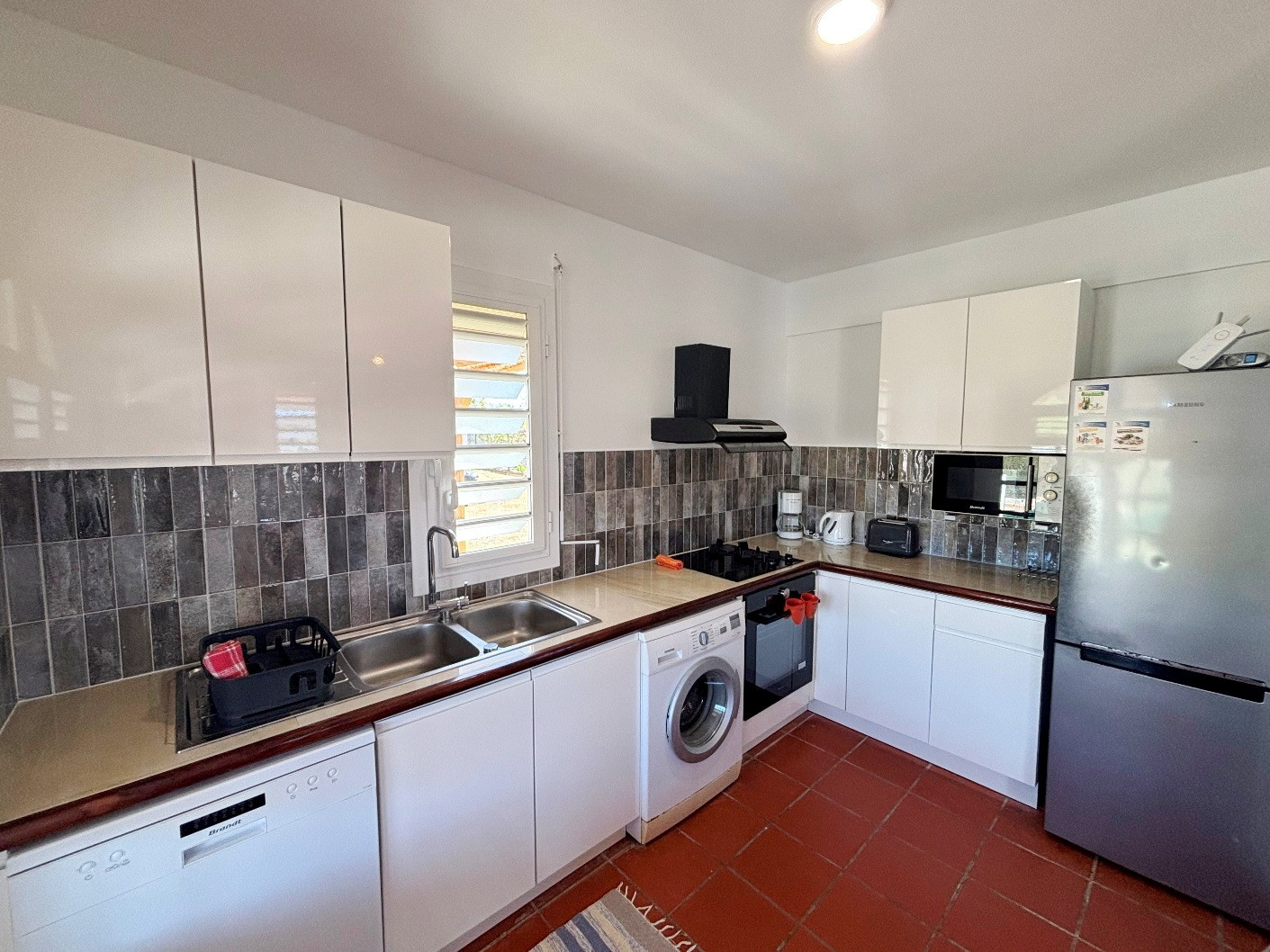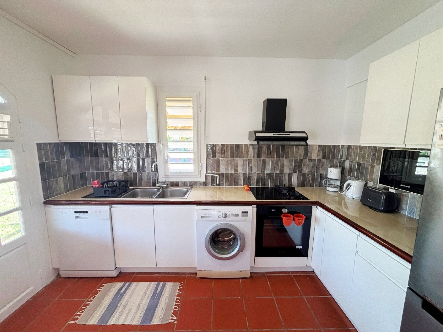 Agencement : la maison compte 1 chambre climatisée en rez de chaussée (lit double de 160 cm), 1 chambre en mezzanine climatisée (3 lits individuels de 90 cm dont 2 rapprochables), 1 salle d'eau (douche, double vasque, wc), cuisine américaine équipée, salon et terrasse..
