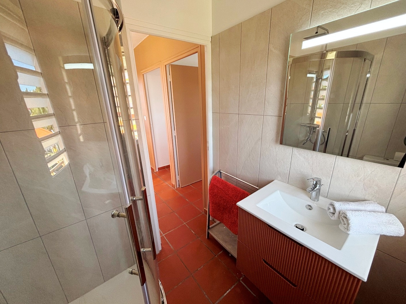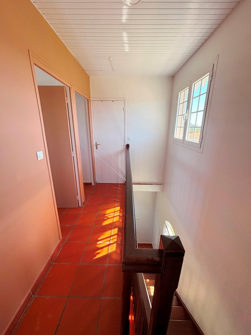 Agencement de la villa : la villa compte 2 chambres climatisées (1 en rez de chaussée avec lit double de 140 et la chambre à l'étage dispose de 3 lits individuels de 90 cm), 1 salle d'eau avec wc, séjour, cuisine américaine équipée, terrasse.